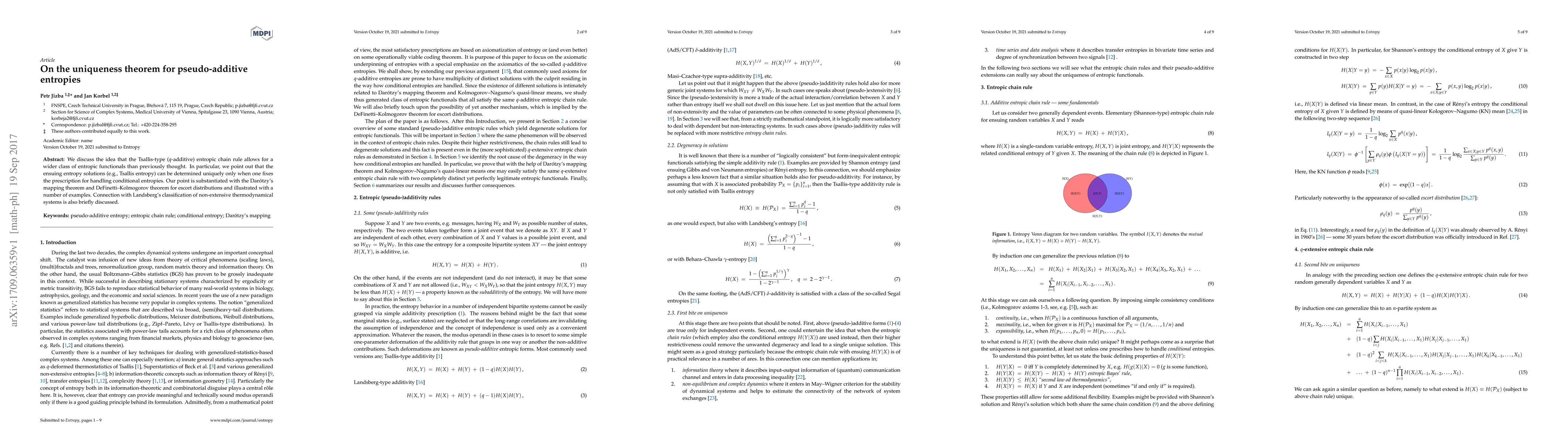 We discuss the idea that the Tsallis-type (q-additive) entropic chain rule allows for a wider class of entropic functionals than previously thought. In particular, we point out that the ensuing entropy solutions (e.g., Tsallis entropy) can be determined uniquely only when one fixes the prescription for handling conditional entropies. Our point is substantiated with the Dar\'otzy's mapping theorem and DeFinetti-Kolmogorov theorem for escort distributions and illustrated with a number of examples. Connection with Landsberg's classification of non-extensive thermodynamical systems is also briefly discussed.