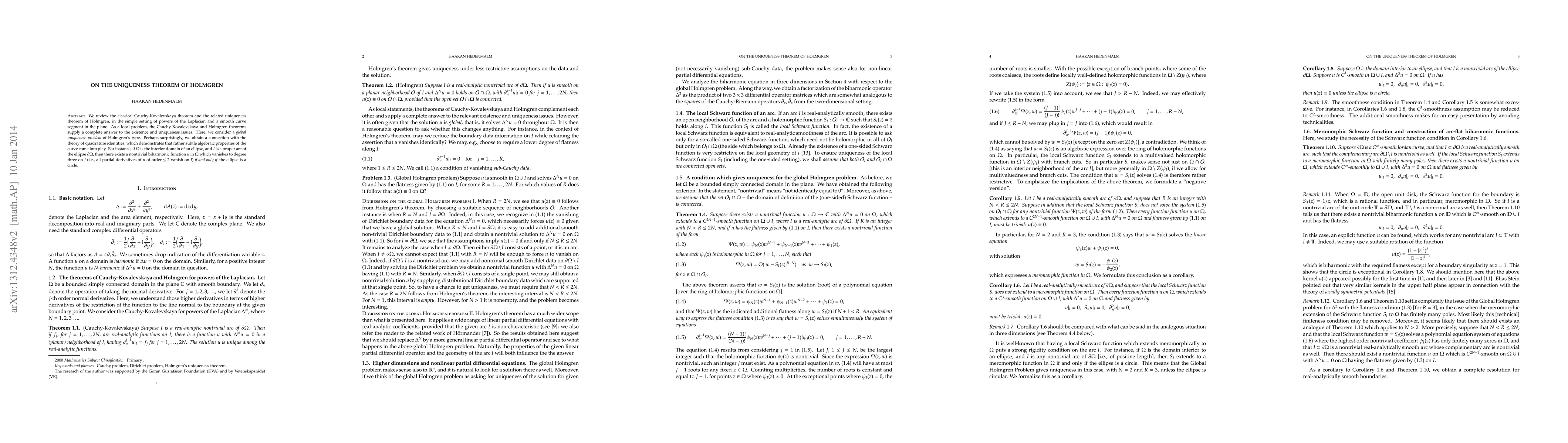 We rereview the classical Cauchy-Kovalevskaya theorem and the related uniqueness theorem of Holmgren, in the simple setting of powers of the Laplacian and a smooth curve segment in the plane. As a local problem, the Cauchy-Kovalevskaya and Holmgren theorems supply a complete answer to the existence and uniqueness issues. Here, we consider a global uniqueness problem of Holmgren's type. Perhaps surprisingly, we obtain a connection with the theory of quadrature identities, which demonstrates that rather subtle algebraic properties of the curve come into play. For instance, if $\Omega$ is the interior domain of an ellipse, and $I$ is a proper arc of the ellipse $\partial\Omega$, then there exists a nontrivial biharmonic function $u$ in $\Omega$ which vanishes to degree three on $I$ (i.e., all partial derivatives of $u$ of order $\le2$ vanish on $I$) if and only if the ellipse is a circle. Finally, we consider a three-dimensional case, and analyze it partially using analogues of the square of the 2X2 Cauchy-Riemann operator.