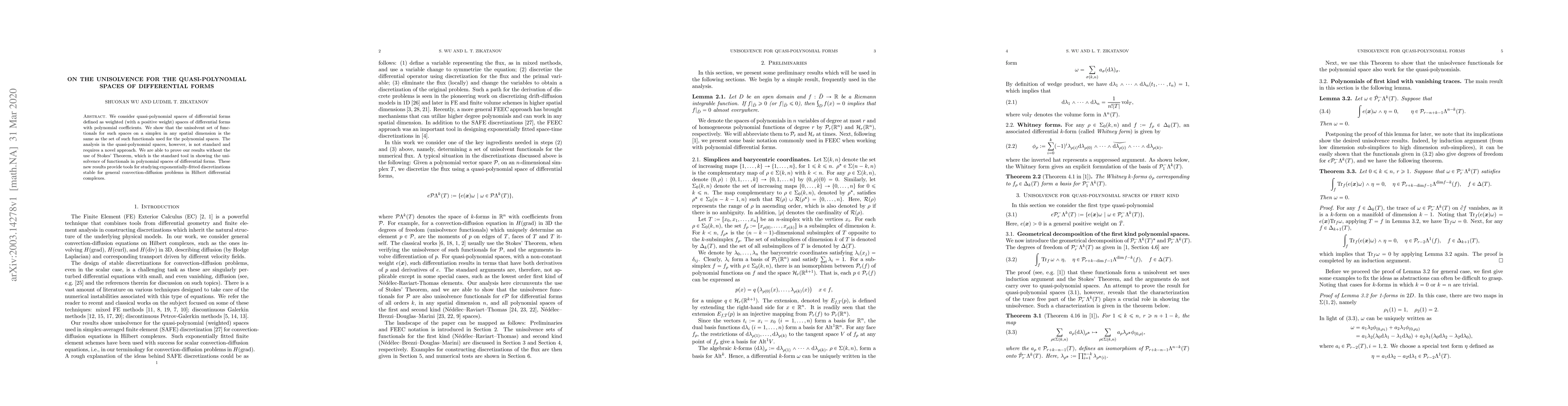 The paper shows that quasi-polynomial spaces of differential forms have the same unisolvence set as polynomial spaces, without relying on Stokes' Theorem, enabling stable discretizations for general convection-diffusion problems.
