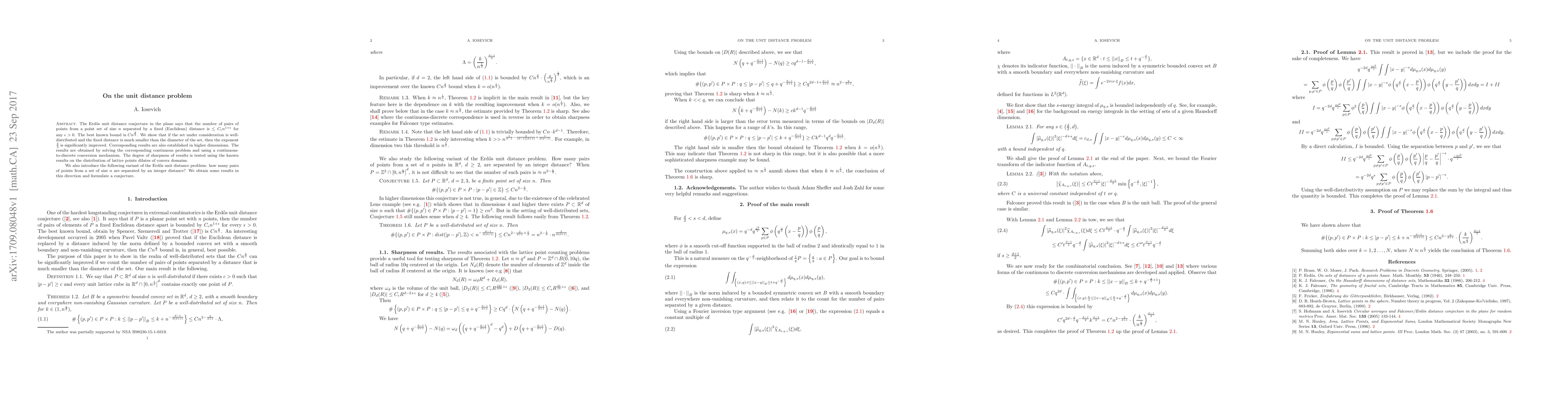 This paper improves the known bound for the number of pairs of points at a fixed distance in well-distributed point sets, achieving a better exponent than the previously best-known $\frac{4}{3}$ bound. It also extends these results to higher dimensions and introduces a variant of the Erdős unit distance problem concerning integer distances, providing new conjectures.