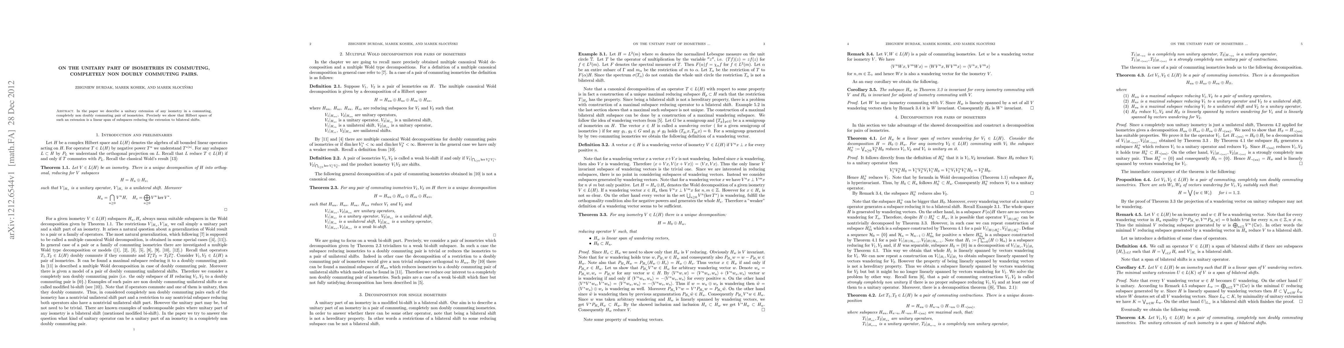 This paper investigates isometries in Hilbert spaces, focusing on pairs of commuting but completely non doubly commuting isometries. It reveals that such pairs lack nontrivial subspaces that reduce both isometries, and it describes the unitary part of one isometry within this context.