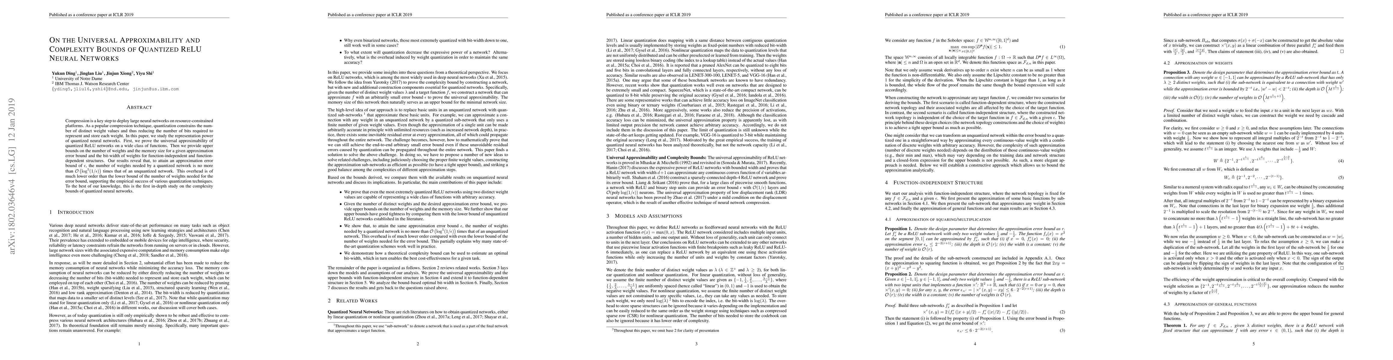 This paper proves the universal approximability of quantized ReLU networks and provides upper bounds on their weight count and memory size, showing that quantization requires only $\mathcal{O}\left(\log^5(1/\epsilon)\right)$ times the weights of unquantized networks to achieve an approximation error bound $\epsilon$.