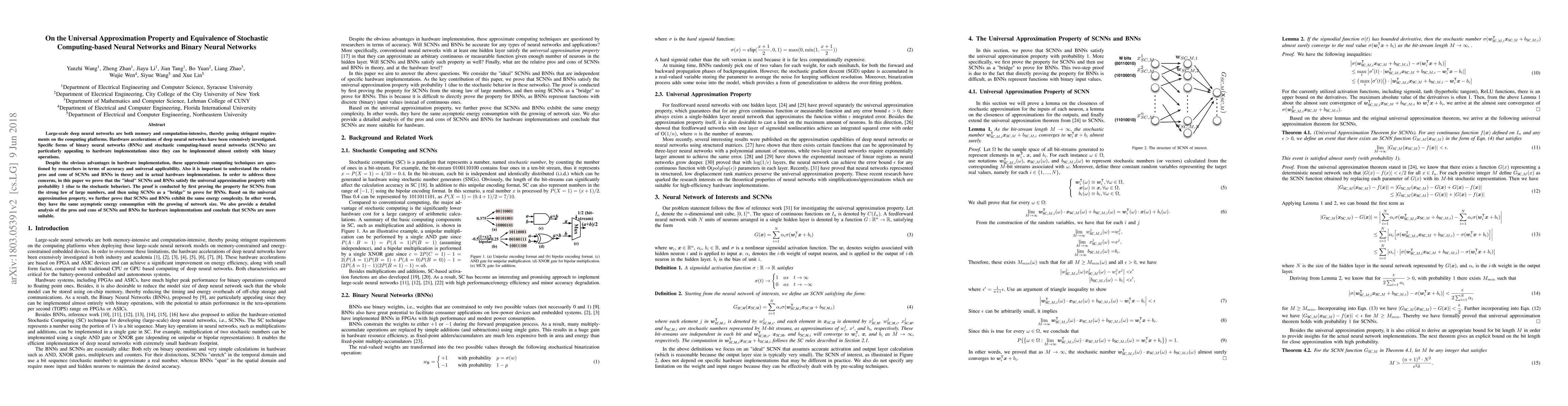 This paper proves that both stochastic computing-based neural networks (SCNNs) and binary neural networks (BNNs) satisfy the universal approximation property, demonstrating their theoretical equivalence. It concludes that SCNNs are more suitable for hardware implementations due to their advantages despite both having the same energy complexity.