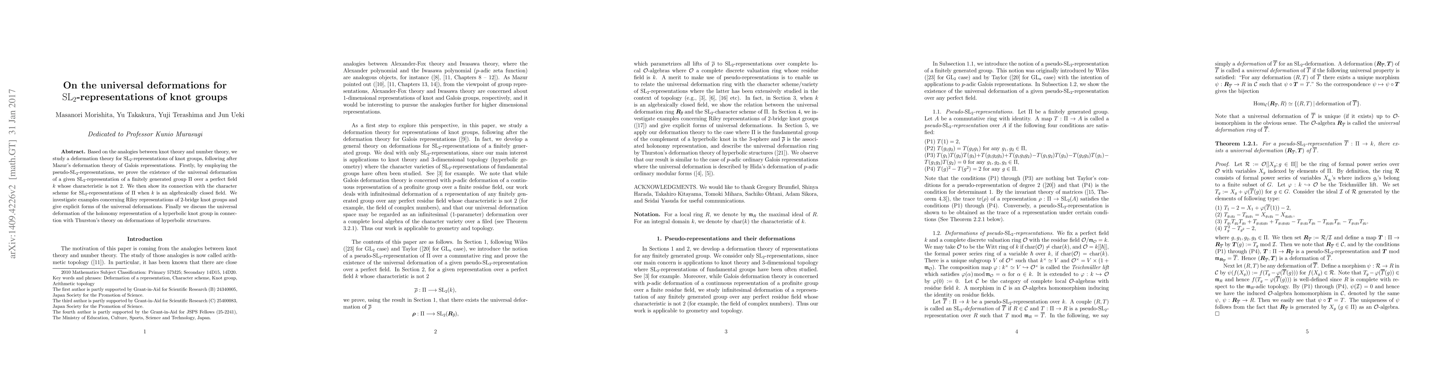 This paper explores the deformation theory for SL_2-representations of knot groups, proving the existence of universal deformations using pseudo-SL_2-representations. It connects these deformations to the character scheme and discusses applications to Riley representations and hyperbolic knot holonomy.