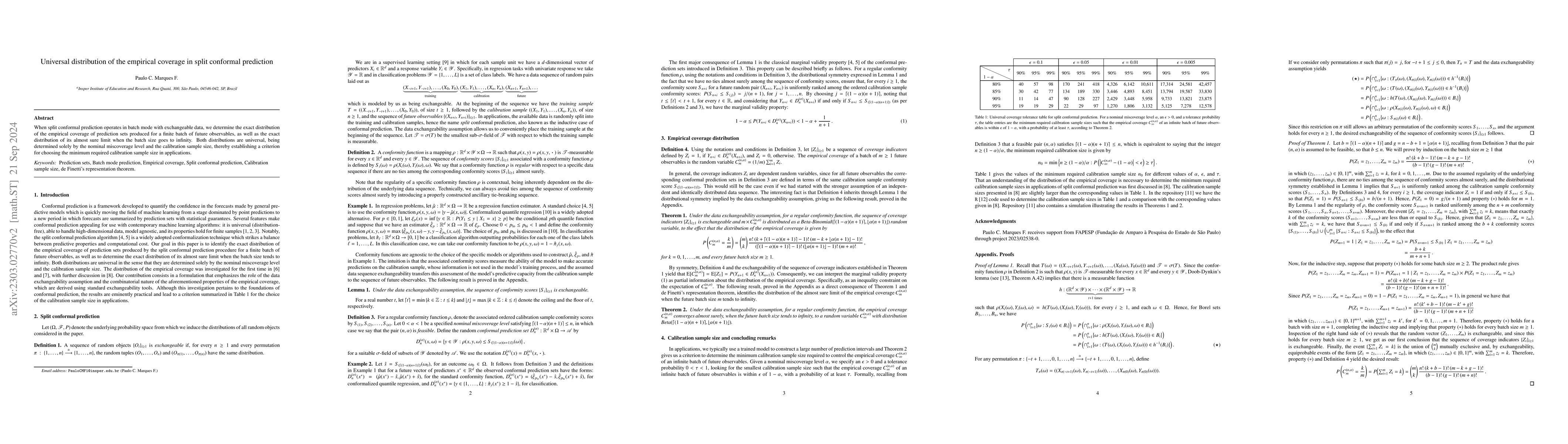 Two additional universal properties are established in the split conformal prediction framework. In a regression setting with exchangeable data, we determine the exact distribution of the coverage of prediction sets for a finite horizon of future observables, as well as the exact distribution of its almost sure limit. The results hold for finite training and calibration samples, and both distributions are determined solely by the nominal miscoverage level and the calibration sample size.