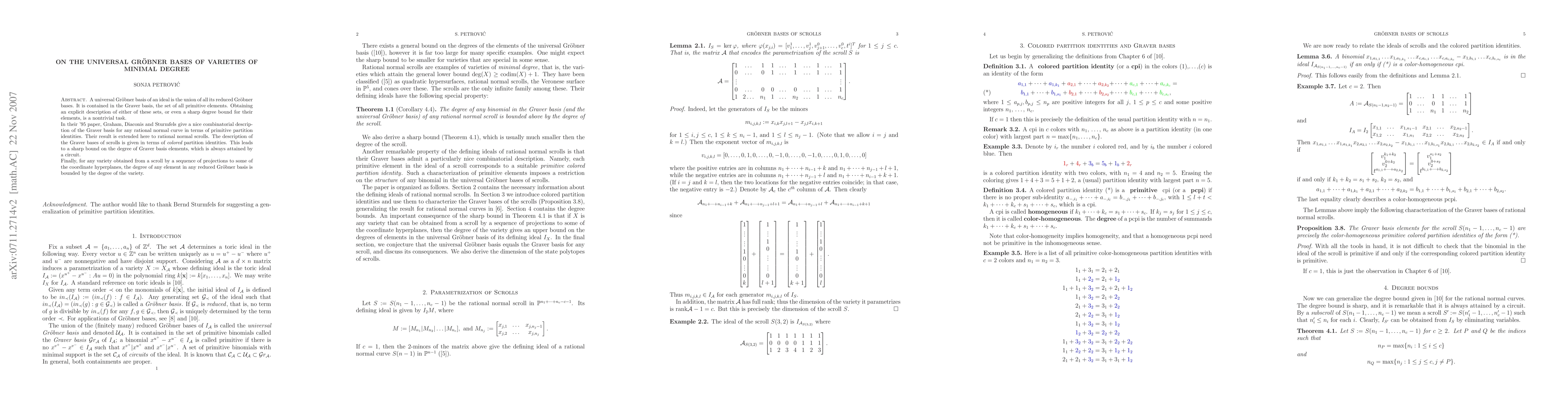 This paper extends the combinatorial description of the Graver basis to rational normal scrolls, providing a sharp degree bound for its elements via colored partition identities. It also establishes a universal bound on the degree of elements in reduced Gröbner bases for varieties derived from scrolls by projections.