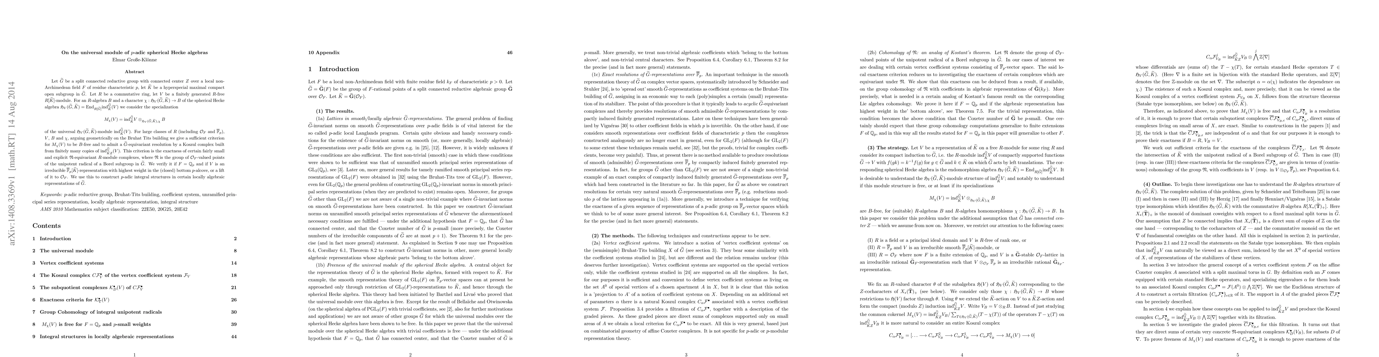 Let $\widetilde{G}$ be a split connected reductive group with connected center $Z$ over a local non-Archimedean field $F$ of residue characteristic $p$, let $\widetilde{K}$ be a hyperspecial maximal compact open subgroup in $\widetilde{G}$. Let $R$ be a commutative ring, let $V$ be a finitely generated $R$-free $R[\widetilde{K}]$-module. For an $R$-algebra $B$ and a character $\chi:{\mathfrak H}_V(\widetilde{G},\widetilde{K})\to B$ of the spherical Hecke algebra ${\mathfrak H}_V(\widetilde{G},\widetilde{K})={\rm End}_{R[\widetilde{G}]}{\rm ind}_{\widetilde{K}}^{\widetilde{G}}(V)$ we consider the specialization $$M_{\chi}(V)={\rm ind}_{\widetilde{K}}^{\widetilde{G}}V\otimes_{{\mathfrak H}_V(\widetilde{G},\widetilde{K}),\chi}B$$ of the universal ${\mathfrak H}_V(\widetilde{G},\widetilde{K})$-module ${\rm ind}_{\widetilde{K}}^{\widetilde{G}}(V)$. For large classes of $R$ (including ${\mathcal O}_F$ and $\overline{\mathbb F}_p$), $V$, $B$ and $\chi$, arguing geometrically on the Bruhat Tits building we give a sufficient criterion for $M_{\chi}(V)$ to be $B$-free and to admit a $\widetilde{G}$-equivariant resolution by a Koszul complex built from finitely many copies of ${\rm ind}_{\widetilde{K}Z}^{\widetilde{G}}(V)$. This criterion is the exactness of certain fairly small and explicit ${\mathfrak N}$-equivariant $R$-module complexes, where ${\mathfrak N}$ is the group of ${\mathcal O}_F$-valued points of the unipotent radical of a Borel subgroup in $\widetilde{G}$. We verify it if $F={\mathbb Q}_p$ and if $V$ is an irreducible $\overline{\mathbb F}_p[\widetilde{K}]$-representation with highest weight in the (closed) bottom $p$-alcove, or a lift of it to ${\mathcal O}_F$. We use this to construct $p$-adic integral structures in certain locally algebraic representations of $\widetilde{G}$.