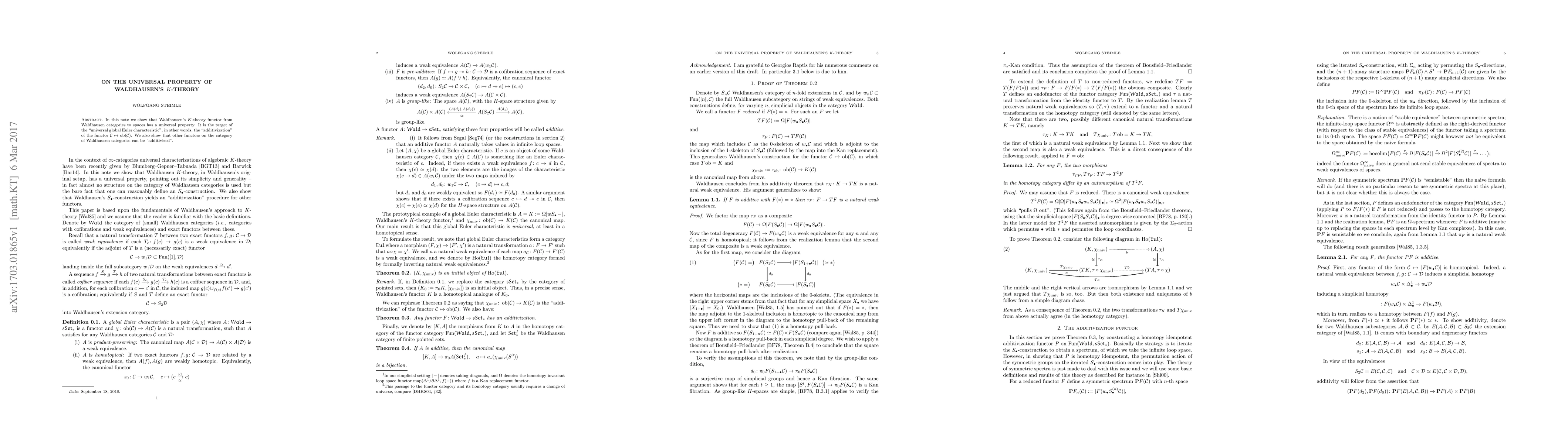 In this note we show that Waldhausen's K-theory functor from Waldhausen categories to spaces has a universal property: It is the target of the "universal global Euler characteristic", in other words, the "additivization" of the functor sending a Waldhausen category C to obj(C) . We also show that a large class of functors possesses such an additivization.