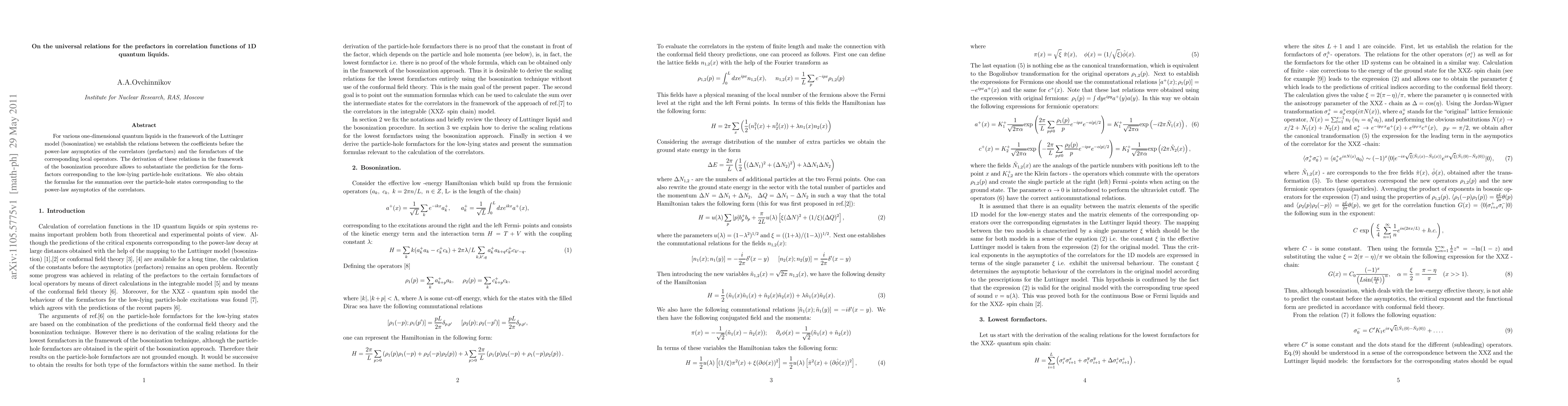 This paper establishes universal relations between the prefactors in the power-law asymptotics of correlation functions and the formfactors of local operators in 1D quantum liquids using the Luttinger model's bosonization framework. It also provides formulas for summing over particle-hole states to predict the formfactors of low-lying excitations.