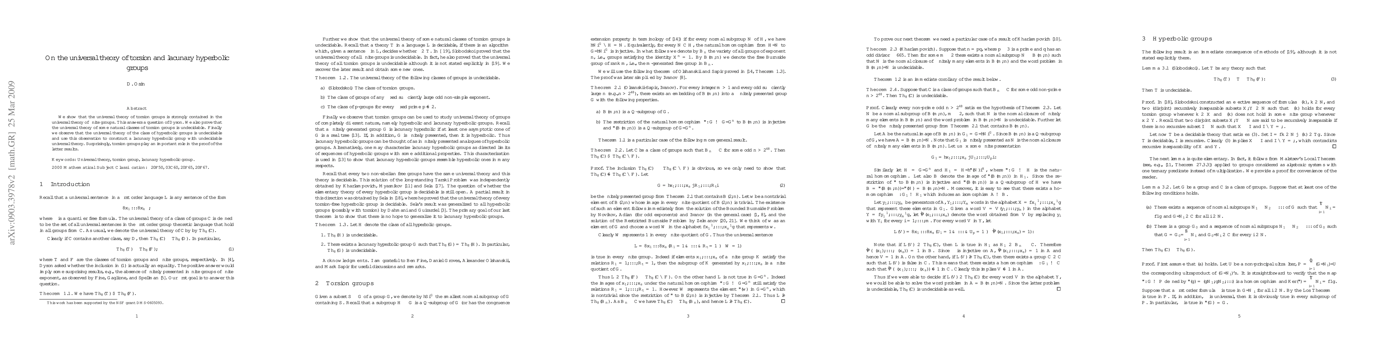 The research demonstrates that the universal theory of torsion groups is a subset of finite groups' theory, resolving a question by Dyson. It also reveals that certain torsion group classes have undecidable universal theories. Interestingly, torsion groups are crucial in proving hyperbolic groups' universal theory is undecidable, enabling the construction of lacunary hyperbolic groups with undecidable universal theories.