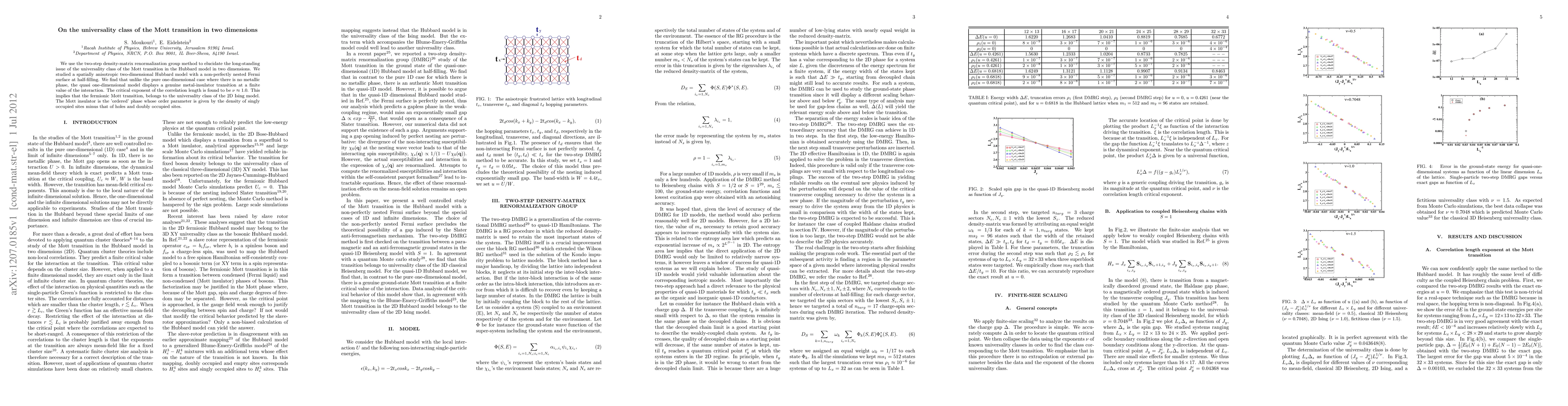 We use the two-step density-matrix renormalization group method to elucidate the long-standing issue of the universality class of the Mott transition in the Hubbard model in two dimensions. We studied a spatially anisotropic two-dimensional Hubbard model with a non-perfectly nested Fermi surface at half-filling. We find that unlike the pure one-dimensional case where there is no metallic phase, the quasi one-dimensional modeldisplays a genuine metal-insulator transition at a finite value of the interaction. The critical exponent of the correlation length is found to be $\nu \approx 1.0$. This implies that the fermionic Mott transition, belongs to the universality class of the 2D Ising model. The Mott insulator is the 'ordered' phase whose order parameter is given by the density of singly occupied sites minus that of holes and doubly occupied sites.