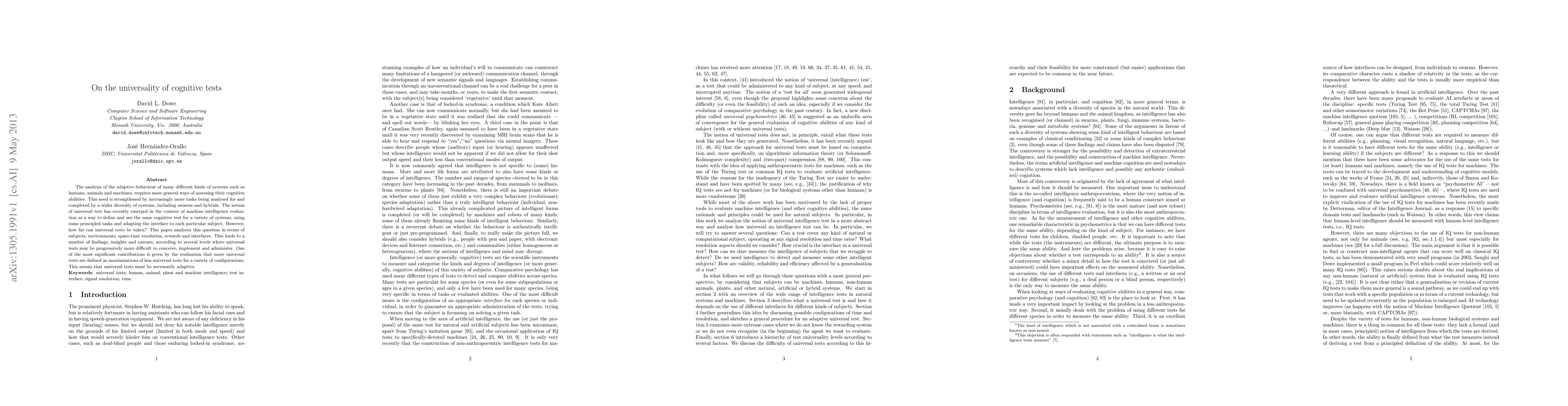 This paper explores the feasibility of universal cognitive tests for diverse systems, identifying challenges in creating adaptive tests that can be applied across different subjects, environments, and interfaces. It concludes that truly universal tests require adaptiveness and are built upon less universal, yet more specific, tests.