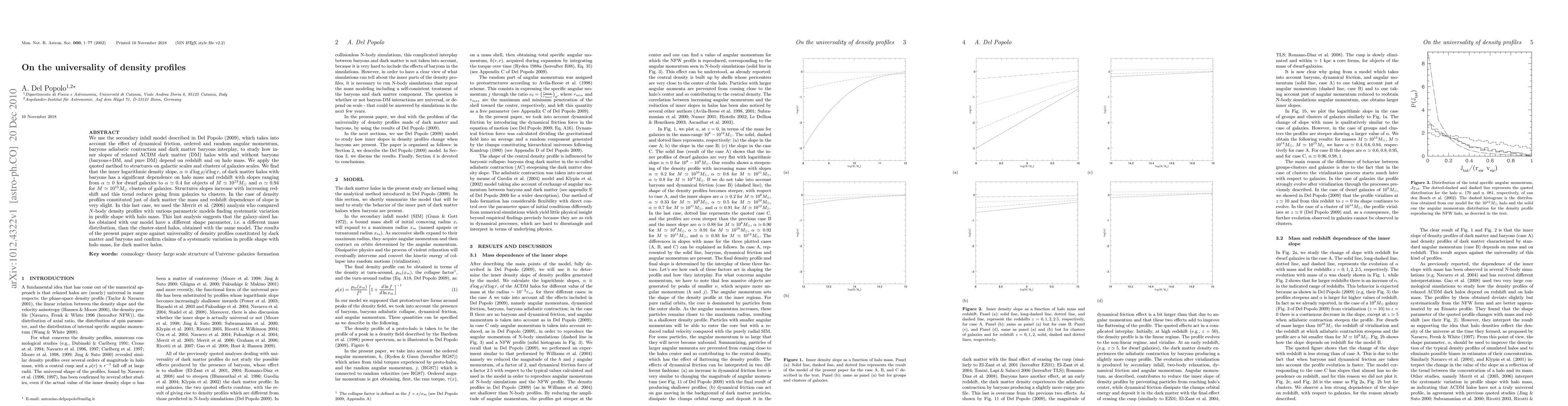 We use the secondary infall model described in Del Popolo (2009), which takes into account the effect of dynamical friction, ordered and random angular momentum, baryons adiabatic contraction and dark matter baryons interplay, to study how in- ner slopes of relaxed LCDM dark matter (DM) halos with and without baryons (baryons+DM, and pure DM) depend on redshift and on halo mass. We apply the quoted method to structures on galactic scales and clusters of galaxies scales. We find that the inner logarithmic density slope, of dark matter halos with baryons has a significant dependence on halo mass and redshift with slopes ranging from 0 for dwarf galaxies to 0.4 for objects of M = 10^13M_solar and 0.94 for M = 10^15M_solar clusters of galaxies. Structures slopes increase with increasing redshift and this trend reduces going from galaxies to clusters. In the case of density profiles constituted just of dark matter the mass and redshift dependence of slope is very slight. In this last case, we used the Merrit et al. (2006) analysis who compared N-body density profiles with various parametric models finding systematic variation in profile shape with halo mass. This last analysis suggests that the galaxy-sized halos obtained with our model have a different shape parameter, i.e. a different mass distribution, than the cluster-sized halos, obtained with the same model. The results of the present paper argue against universality of density profiles constituted by dark matter and baryons and confirm claims of a systematic variation in profile shape with halo mass, for dark matter halos.
