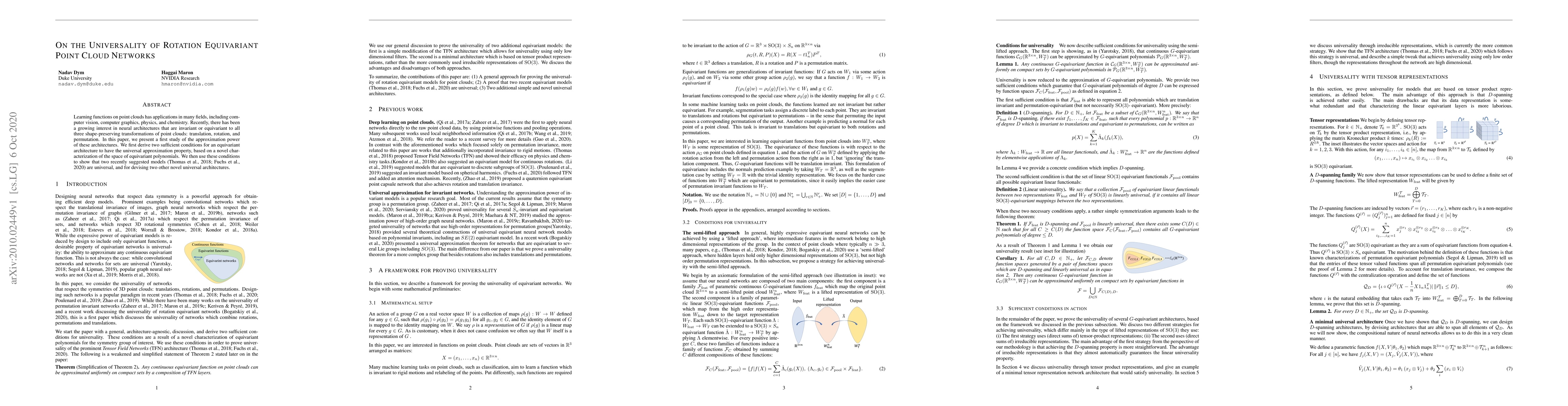 This paper investigates the approximation capabilities of rotation equivariant point cloud networks, establishing sufficient conditions for universal approximation based on equivariant polynomials. It demonstrates the universality of two existing models and proposes two new universal architectures.