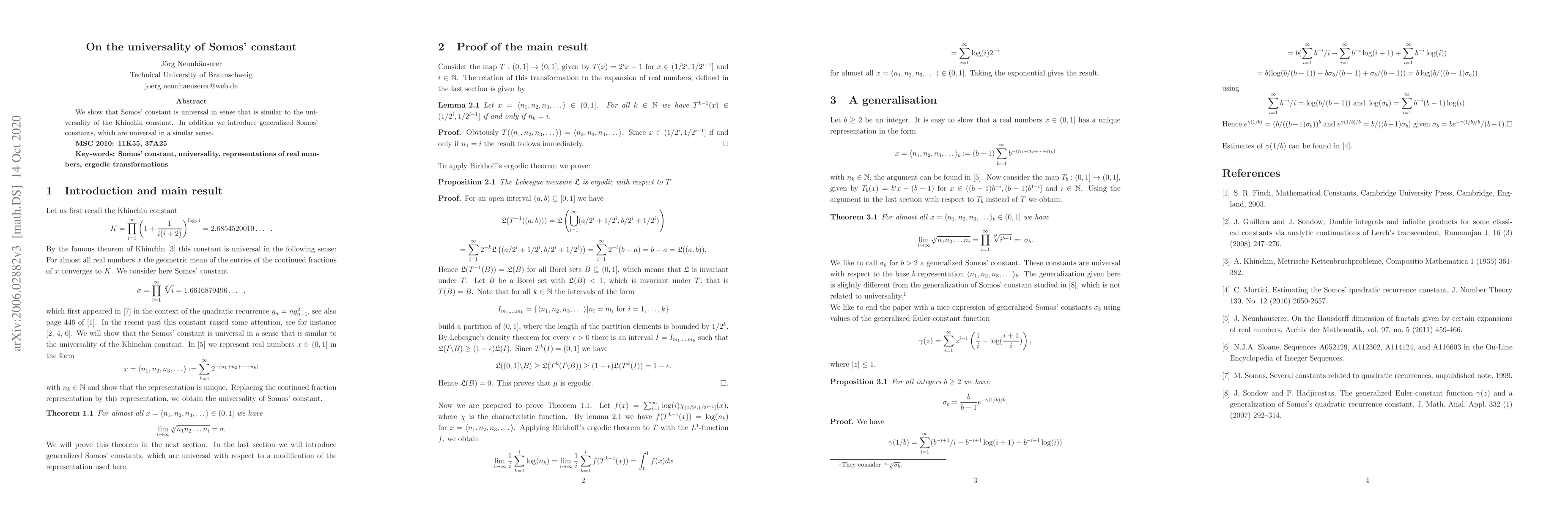 We show that Somos' constant is universal in sense that is similar to the universality of the Khinchin constant. In addition we introduce generalized Somos' constants, which are universal in a similar sense.