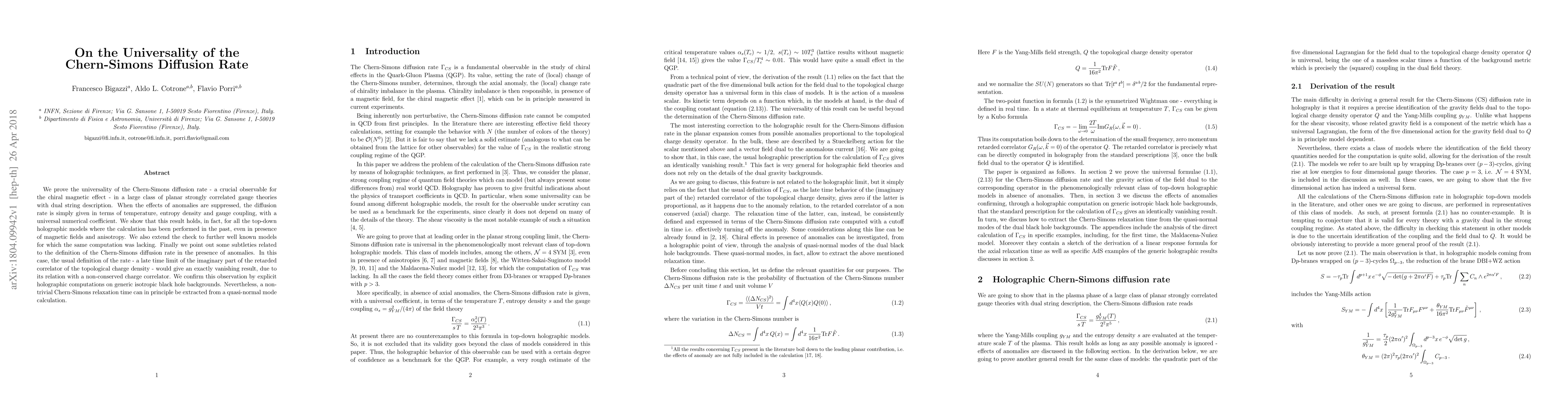 The research proves the universality of the Chern-Simons diffusion rate in strongly correlated gauge theories, revealing a numerical coefficient dependent on temperature, entropy density, and gauge coupling. The findings apply broadly across holographic models, even under magnetic fields and anisotropy, despite complexities in anomaly scenarios.
