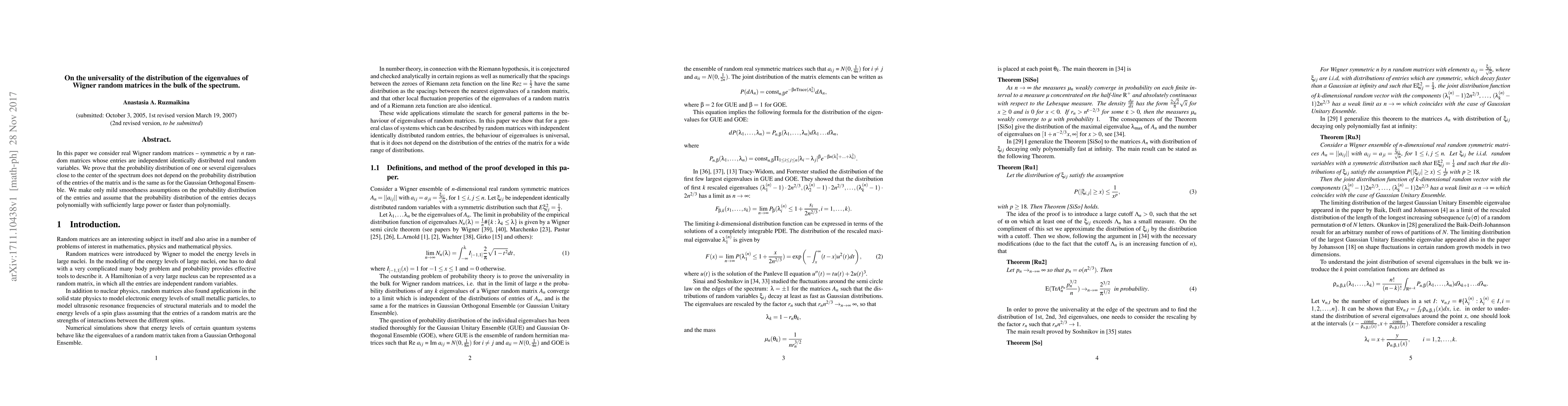 In this paper we consider Wigner random matrices -- symmetric n by n random matrices whose entries are independent identically distributed real random variables. We prove that the probability distribution of one or several eigenvalues close to the center of the spectrum does not depend on the probability distribution of the entries of the matrix and is the same as for the Gaussian Orthogonal Ensemble. We make only mild smoothness assumptions on the probability distribution of the entries and assume that the probability distribution of the entries decays polynomially with sufficiently large power or faster than polynomially.