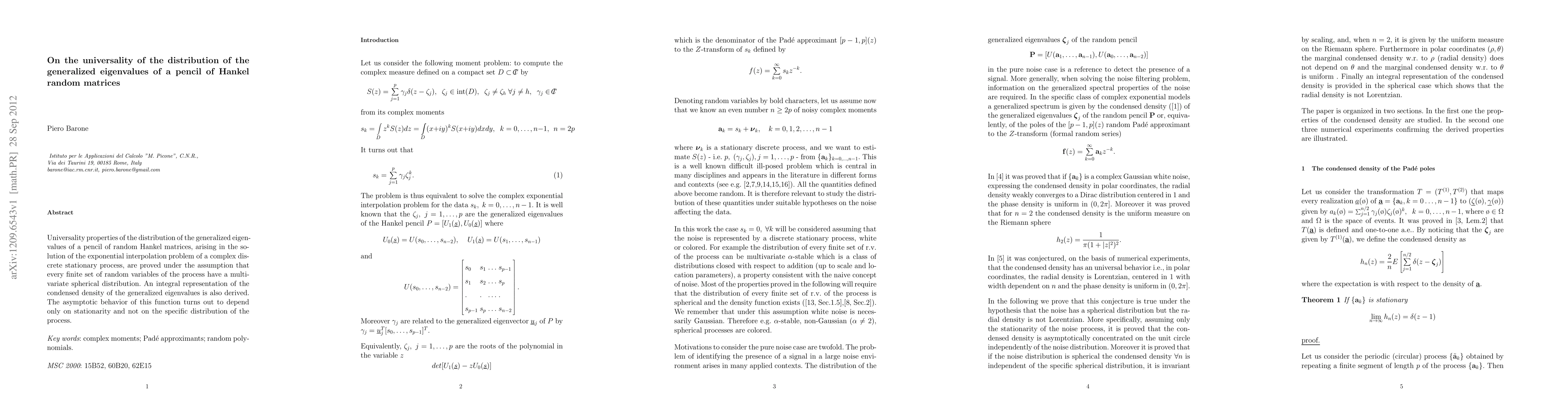 Universality properties of the distribution of the generalized eigenvalues of a pencil of random Hankel matrices, arising in the solution of the exponential interpolation problem of a complex discrete stationary process, are proved under the assumption that every finite set of random variables of the process have a multivariate spherical distribution. An integral representation of the condensed density of the generalized eigenvalues is also derived. The asymptotic behavior of this function turns out to depend only on stationarity and not on the specific distribution of the process.