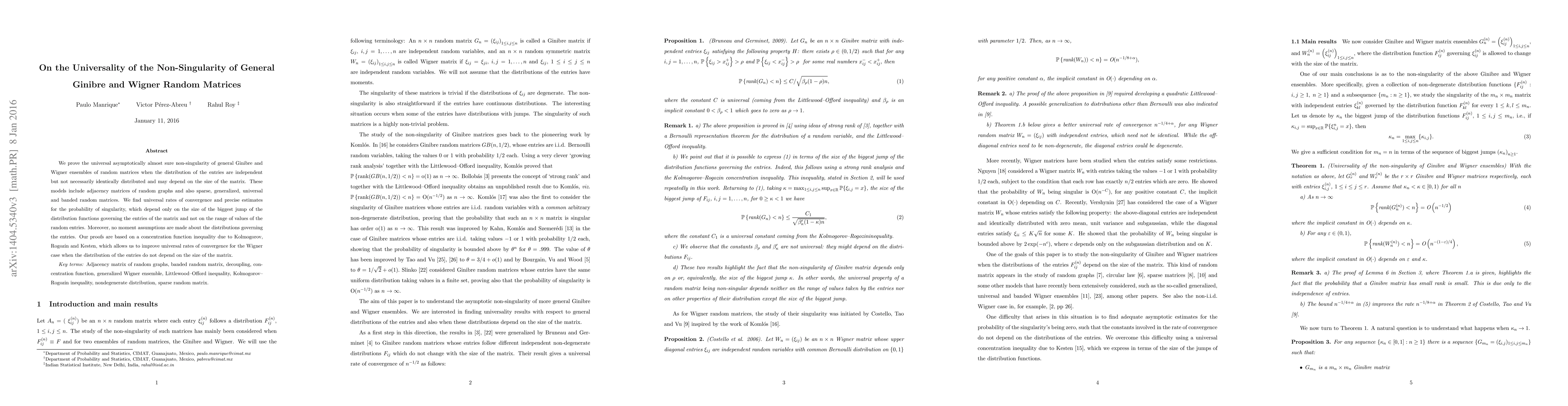 We prove the universal asymptotically almost sure non-singularity of general Ginibre and Wigner ensembles of random matrices when the distribution of the entries are independent but not necessarily identically distributed and may depend on the size of the matrix. These models include adjacency matrices of random graphs and also sparse, generalized, universal and banded random matrices. We find universal rates of convergence and precise estimates for the probability of singularity which depend only on the size of the biggest jump of the distribution functions governing the entries of the matrix and not on the range of values of the random entries. Moreover, no moment assumptions are made about the distributions governing the entries. Our proofs are based on a concentration function inequality due to Kolmogorov, Rogozin and Kesten, which allows us to improve universal rates of convergence for the Wigner case when the distribution of the entries do not depend on the size of the matrix.