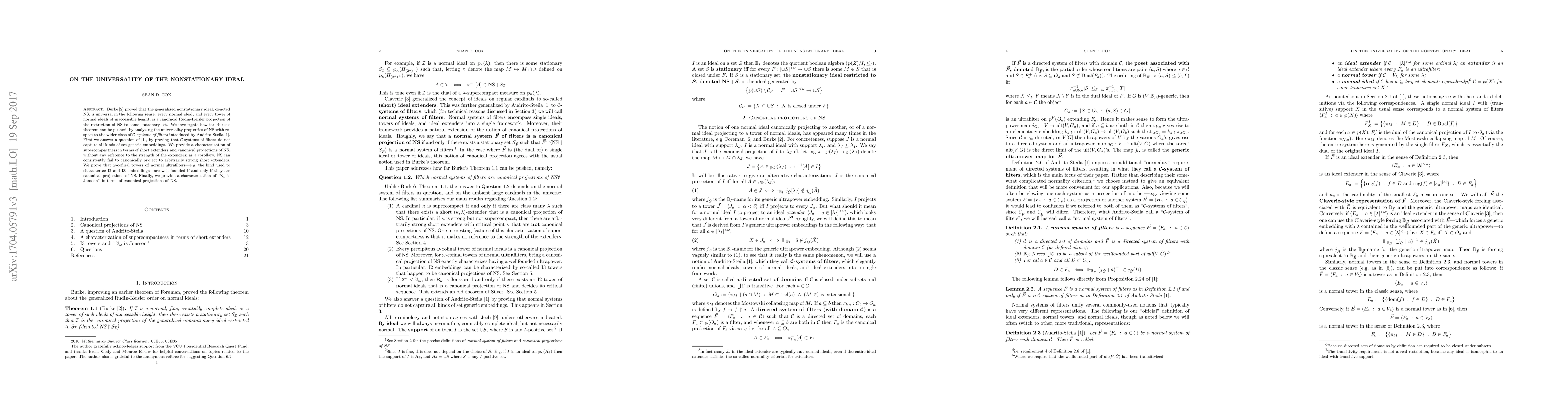 The paper investigates the universality of the generalized nonstationary ideal (NS) in relation to ’C-systems of filters, which were introduced to expand Burke's theorem on normal ideals. The study reveals that NS can consistently fail to canonically project to arbitrarily strong short extenders and provides new characterizations of supercompactness and Jonsson embeddings in terms of canonical projections of NS.