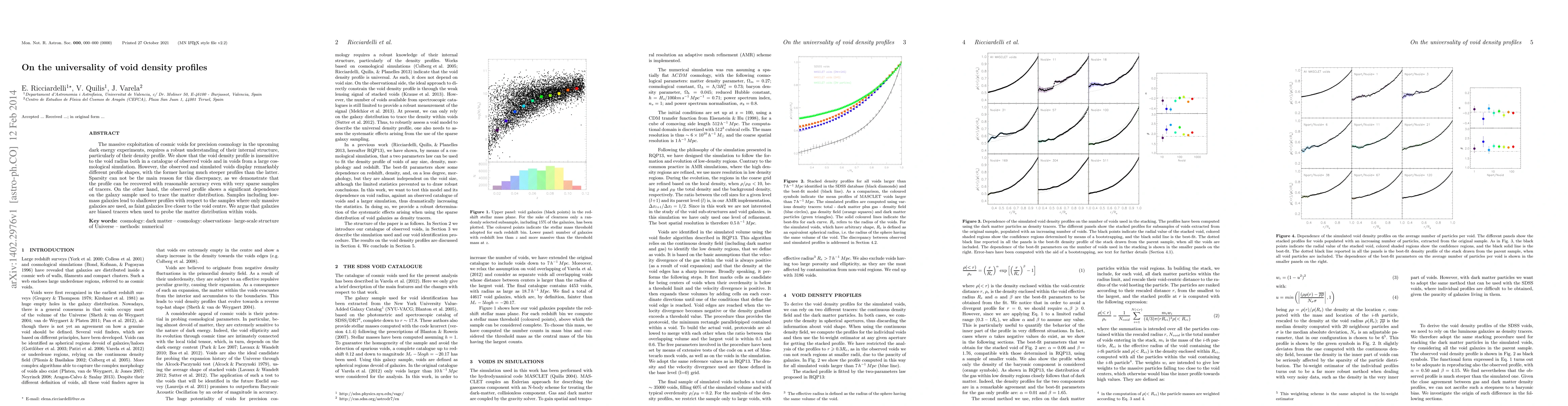 This paper demonstrates that the density profile of cosmic voids is consistent across different void radii in both observed and simulated data. However, observed voids show steeper profiles than simulations, likely due to the bias of galaxy tracers, particularly low-mass galaxies, which affect the profile shape.