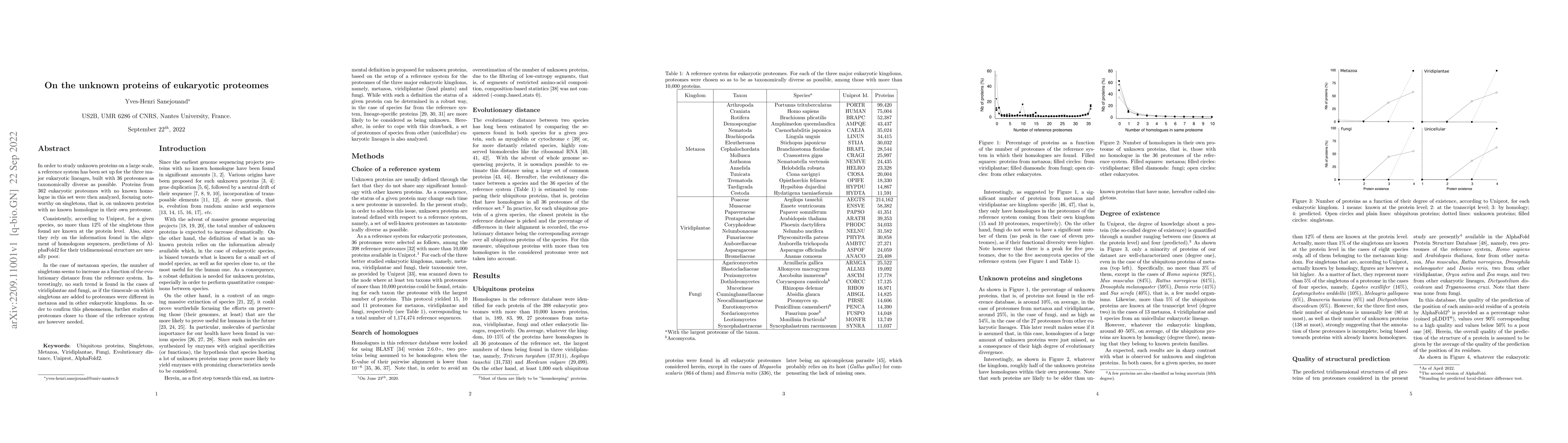 This paper establishes a reference system for studying unknown proteins across three major eukaryotic lineages, analyzing 362 proteomes for singletons—proteins without known homologues. It finds that up to 12% of these singletons remain unknown at the protein level, and their structural predictions are often inaccurate. Metazoan species show a higher number of singletons correlating with evolutionary distance, unlike viridiplantae and fungi, suggesting different timescales for singleton addition.