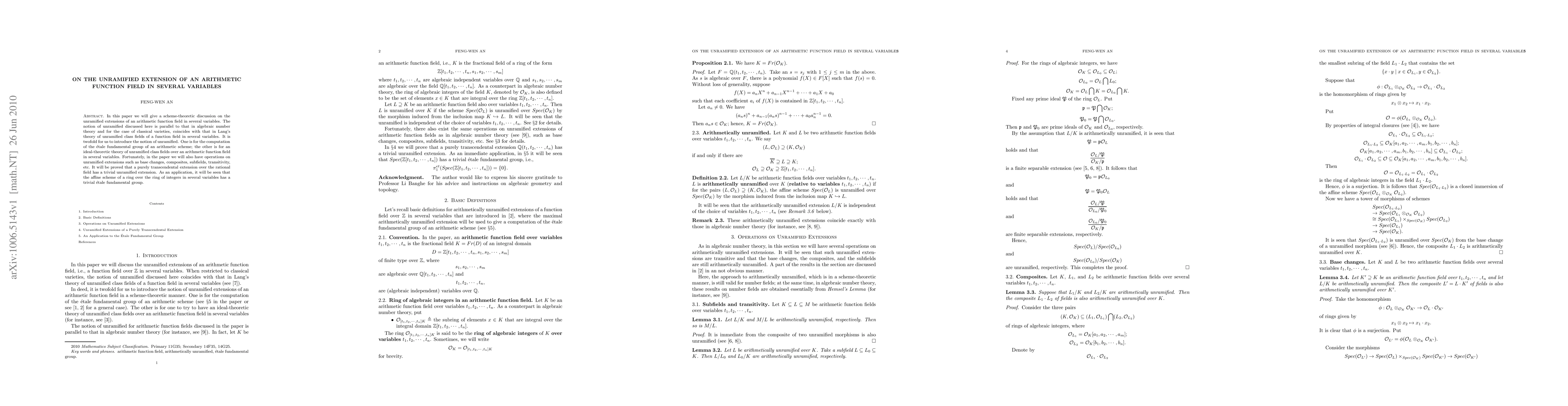 In this paper we will give a scheme-theoretic discussion on the unramified extensions of an arithmetic function field in several variables. The notion of unramified discussed here is parallel to that in algebraic number theory and for the case of classical varieties, coincides with that in Lang's theory of unramified class fields of a function field in several variables. It is twofold for us to introduce the notion of unramified. One is for the computation of the \'{e}tale fundamental group of an arithmetic scheme; the other is for an ideal-theoretic theory of unramified class fields over an arithmetic function field in several variables. Fortunately, in the paper we will also have operations on unramified extensions such as base changes, composites, subfields, transitivity, etc. It will be proved that a purely transcendental extension over the rational field has a trivial unramified extension. As an application, it will be seen that the affine scheme of a ring over the ring of integers in several variables has a trivial \'{e}tale fundamental group.