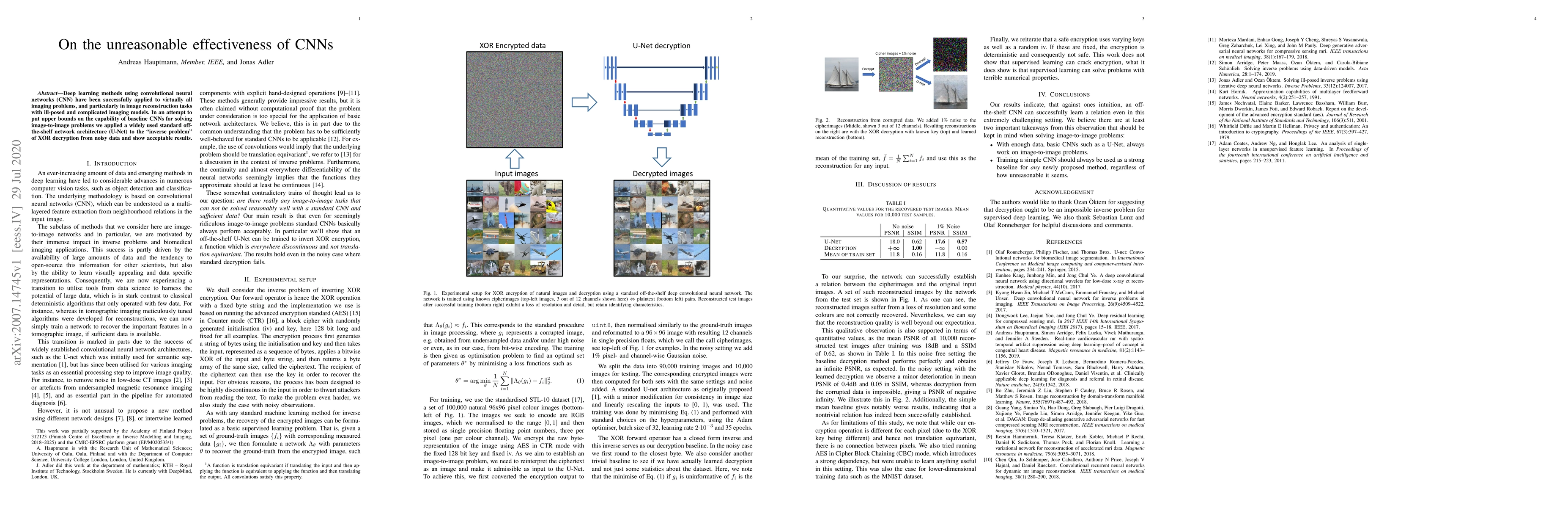 Deep learning methods using convolutional neural networks (CNN) have been successfully applied to virtually all imaging problems, and particularly in image reconstruction tasks with ill-posed and complicated imaging models. In an attempt to put upper bounds on the capability of baseline CNNs for solving image-to-image problems we applied a widely used standard off-the-shelf network architecture (U-Net) to the "inverse problem" of XOR decryption from noisy data and show acceptable results.