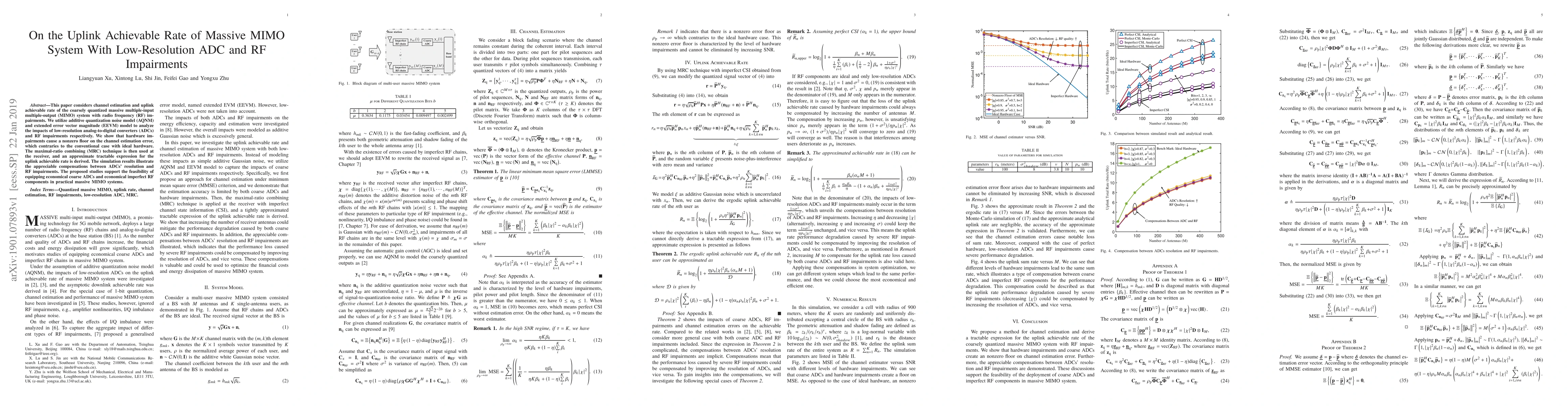 This paper investigates the uplink achievable rate in a massive MIMO system with low-resolution ADCs and RF impairments, showing that hardware imperfections introduce a nonzero channel estimation error floor. The study proposes an approximate expression for the uplink rate and demonstrates feasible compensations between ADC resolution and RF impairments, supporting the use of economical coarse ADCs and imperfect RF components in practical systems.