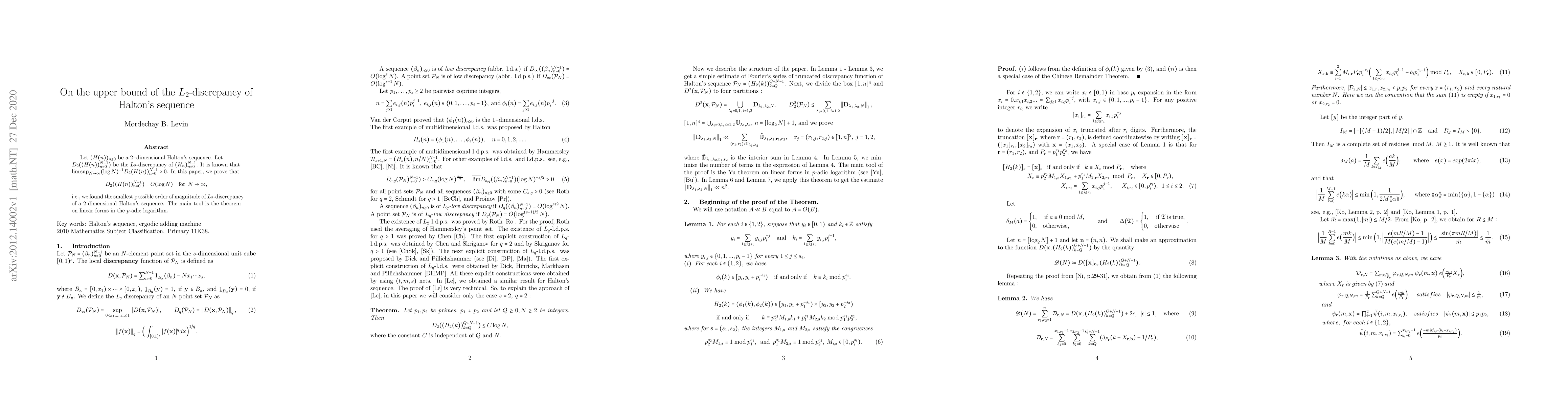 Let $(H(n))_{n \geq 0} $ be a $2-$dimensional Halton's sequence. Let $D_{2} ( (H(n))_{n=0}^{N-1}) $ be the $L_2$-discrepancy of $ (H_n)_{n=0}^{N-1} $. It is known that $\limsup_{N \to \infty } (\log N)^{-1} D_{2} ( H(n) )_{n=0}^{N-1} >0$. In this paper, we prove that $$D_{2} (( H(n) )_{n=0}^{N-1}) =O( \log N) \quad {\rm for} \; \; N \to \infty ,$$ i.e., we found the smallest possible order of magnitude of $L_2$-discrepancy of a 2-dimensional Halton's sequence. The main tool is the theorem on linear forms in the $p$-adic logarithm.