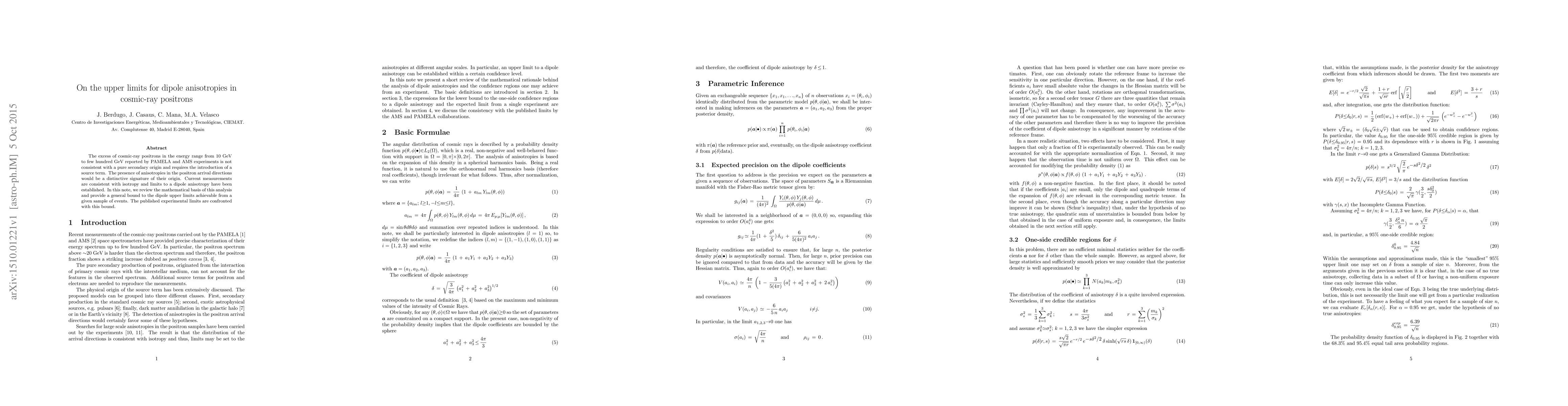 This paper discusses the upper limits for dipole anisotropies in cosmic-ray positrons, finding current measurements align with isotropy. It presents a mathematical basis for setting these limits and compares published experimental limits to its derived bound.