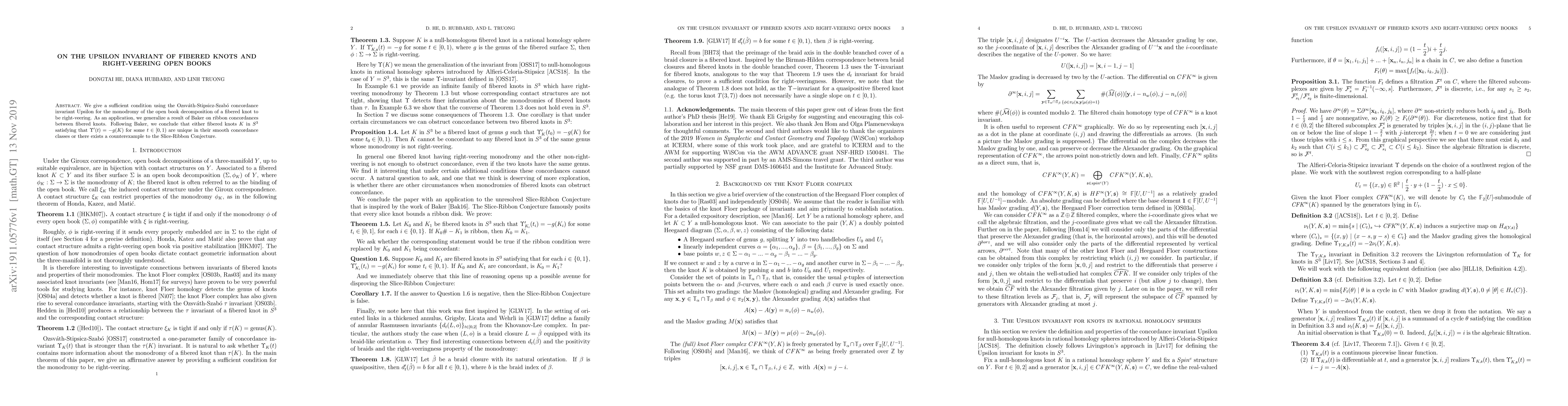 This paper provides a condition using the Upsilon invariant to determine if the monodromy of an open book decomposition of a fibered knot is right-veering. It generalizes Baker's result on ribbon concordances between fibered knots, suggesting that fibered knots with specific Upsilon values may either be unique or imply a counterexample to the Slice-Ribbon Conjecture.