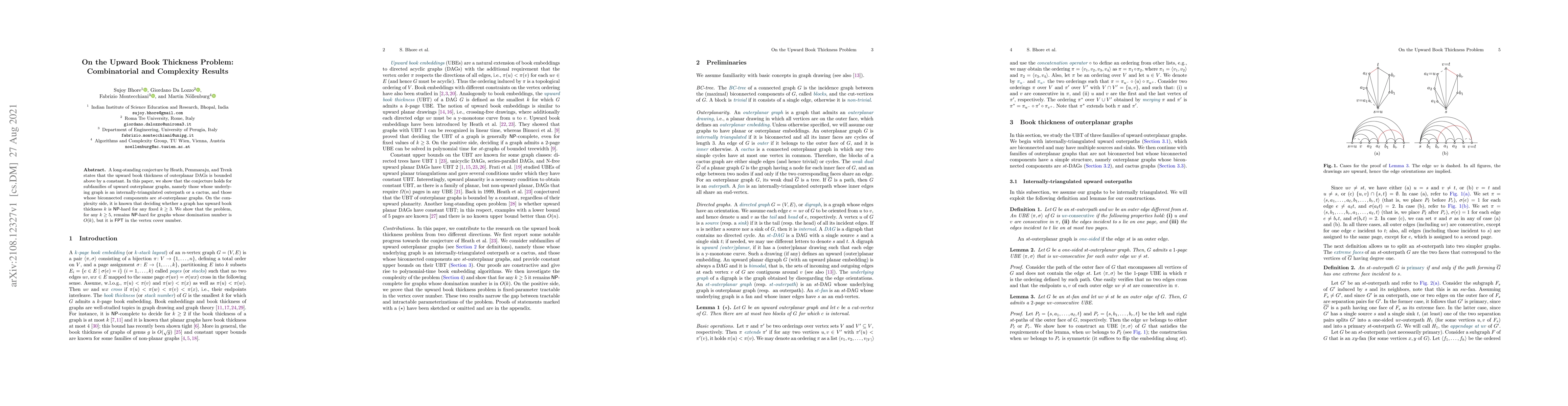 This paper confirms the conjecture that the upward book thickness of certain subfamilies of upward outerplanar directed acyclic graphs (DAGs) is bounded by a constant. It also demonstrates that determining the upward book thickness remains NP-hard for specific graph classes but is fixed-parameter tractable in terms of vertex cover number.