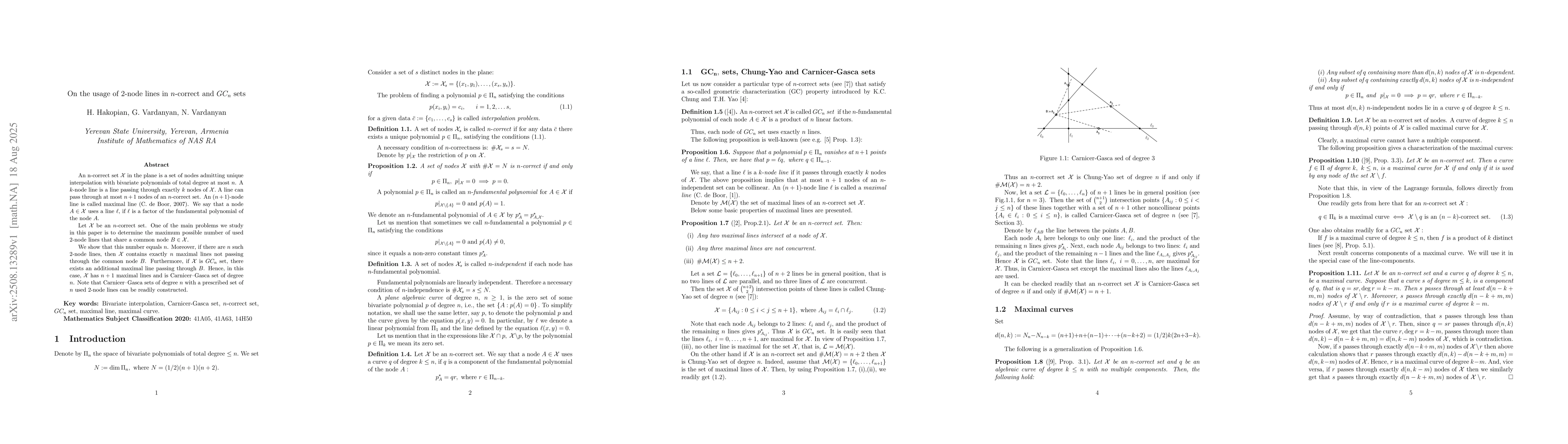 An $n$-correct set $\mathcal{X}$ in the plane is a set of nodes admitting unique interpolation with bivariate polynomials of total degree at most $n$. A $k$-node line is a line passing through exactly $k$ nodes of $\mathcal{X}.$ A line can pass through at most $n+1$ nodes of an $n$-correct set. An $(n+1)$-node line is called maximal line (C. de Boor, 2007). We say that a node $A\in\mathcal{X}$ uses a line $\ell,$ if $\ell$ is a factor of the fundamental polynomial of the node $A.$ Let $\mathcal{X}$ be an $n$-correct set. One of the main problems we study in this paper is to determine the maximum possible number of used $2$-node lines that share a common node $B \in\mathcal{X}.$ We show that this number equals $n$. Moreover, if there are $n$ such $2$-node lines, then $\mathcal{X}$ contains exactly $n$ maximal lines not passing through the common node $B$. Furthermore, if $\mathcal{X}$ is $GC_n$ set, there exists an additional maximal line passing through $B$. Hence, in this case, $\mathcal{X}$ has $n+1$ maximal lines and is Carnicer~Gasca set of degree $n$. Note that Carnicer~Gasca sets of degree $n$ with a prescribed set of $n$ used $2$-node lines can be readily constructed.