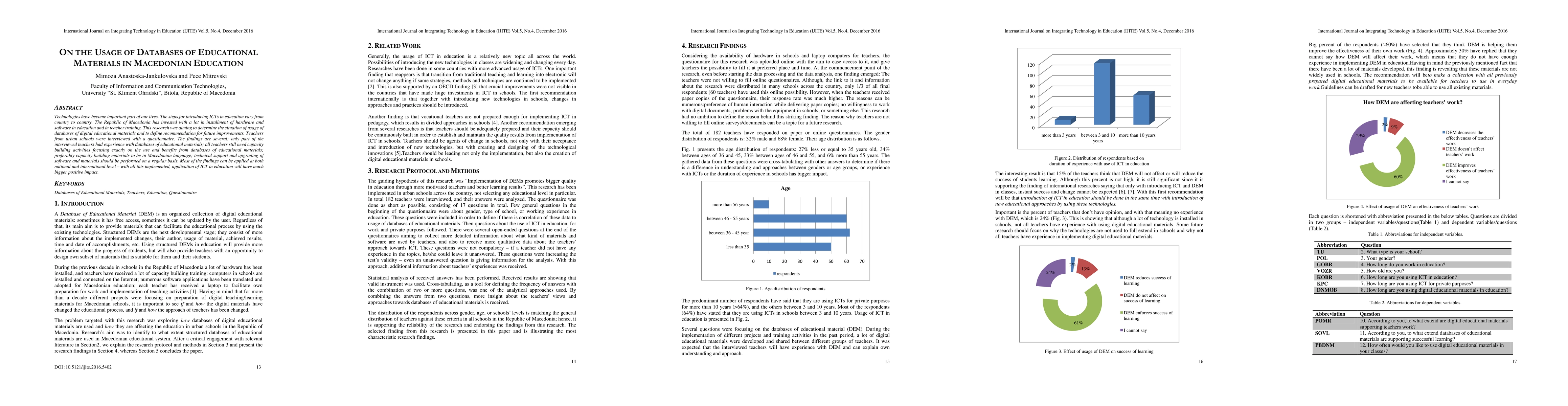 Technologies have become important part of our lives. The steps for introducing ICTs in education vary from country to country. The Republic of Macedonia has invested with a lot in installment of hardware and software in education and in teacher training. This research was aiming to determine the situation of usage of databases of digital educational materials and to define recommendation for future improvements. Teachers from urban schools were interviewed with a questionnaire. The findings are several: only part of the interviewed teachers had experience with databases of educational materials; all teachers still need capacity building activities focusing exactly on the use and benefits from databases of educational materials; preferably capacity building materials to be in Macedonian language; technical support and upgrading of software and materials should be performed on a regular basis. Most of the findings can be applied at both national and international level - with all this implemented, application of ICT in education will have much bigger positive impact.