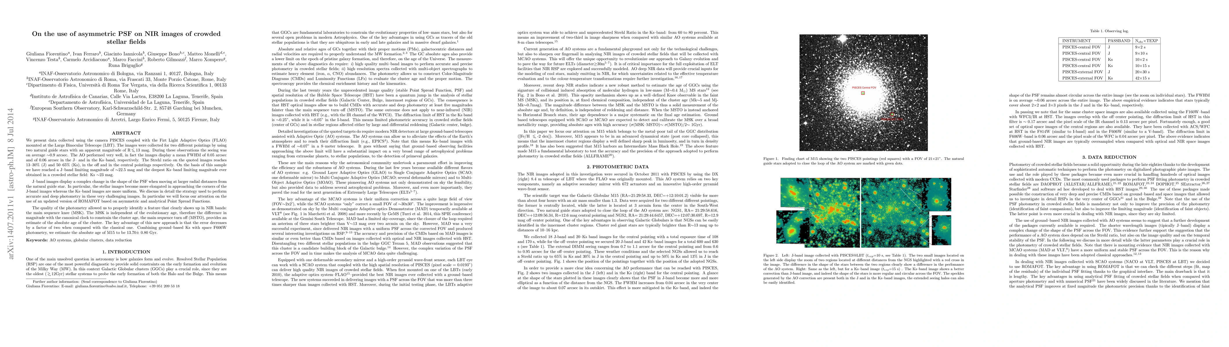 We present data collected using the camera PISCES coupled with the Firt Light Adaptive Optics (FLAO) mounted at the Large Binocular Telescope (LBT). The images were collected using two natural guide stars with an apparent magnitude of R<13 mag. During these observations the seeing was on average ~0.9". The AO performed very well: the images display a mean FWHM of 0.05 arcsec and of 0.06 arcsec in the J- and in the Ks-band, respectively. The Strehl ratio on the quoted images reaches 13-30% (J) and 50-65% (Ks), in the off and in the central pointings respectively. On the basis of this sample we have reached a J-band limiting magnitude of ~22.5 mag and the deepest Ks-band limiting magnitude ever obtained in a crowded stellar field: Ks~23 mag. J-band images display a complex change in the shape of the PSF when moving at larger radial distances from the natural guide star. In particular, the stellar images become more elongated in approaching the corners of the J-band images whereas the Ks-band images are more uniform. We discuss in detail the strategy used to perform accurate and deep photometry in these very challenging images. In particular we will focus our attention on the use of an updated version of ROMAFOT based on asymmetric and analytical Point Spread Functions. The quality of the photometry allowed us to properly identify a feature that clearly shows up in NIR bands: the main sequence knee (MSK). The MSK is independent of the evolutionary age, therefore the difference in magnitude with the canonical clock to constrain the cluster age, the main sequence turn off (MSTO), provides an estimate of the absolute age of the cluster. The key advantage of this new approach is that the error decreases by a factor of two when compared with the classical one. Combining ground-based Ks with space F606W photometry, we estimate the absolute age of M15 to be 13.70+-0.80 Gyr.