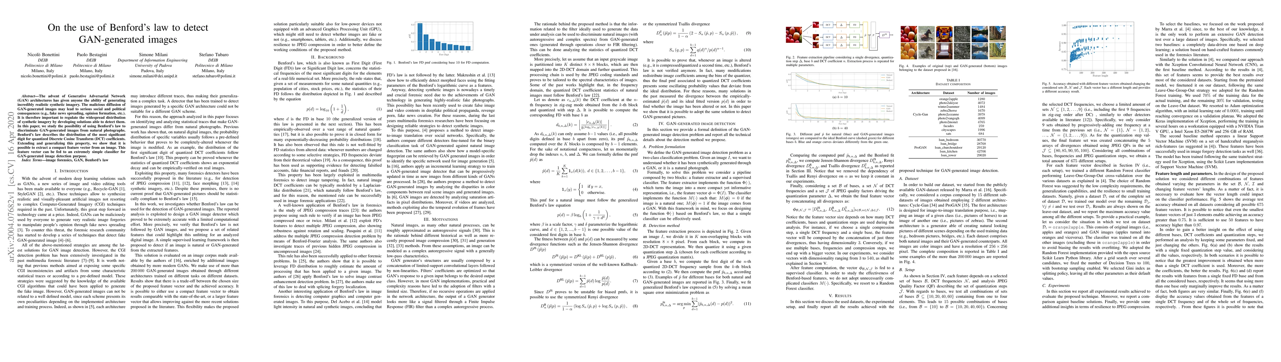 The advent of Generative Adversarial Network (GAN) architectures has given anyone the ability of generating incredibly realistic synthetic imagery. The malicious diffusion of GAN-generated images may lead to serious social and political consequences (e.g., fake news spreading, opinion formation, etc.). It is therefore important to regulate the widespread distribution of synthetic imagery by developing solutions able to detect them. In this paper, we study the possibility of using Benford's law to discriminate GAN-generated images from natural photographs. Benford's law describes the distribution of the most significant digit for quantized Discrete Cosine Transform (DCT) coefficients. Extending and generalizing this property, we show that it is possible to extract a compact feature vector from an image. This feature vector can be fed to an extremely simple classifier for GAN-generated image detection purpose.