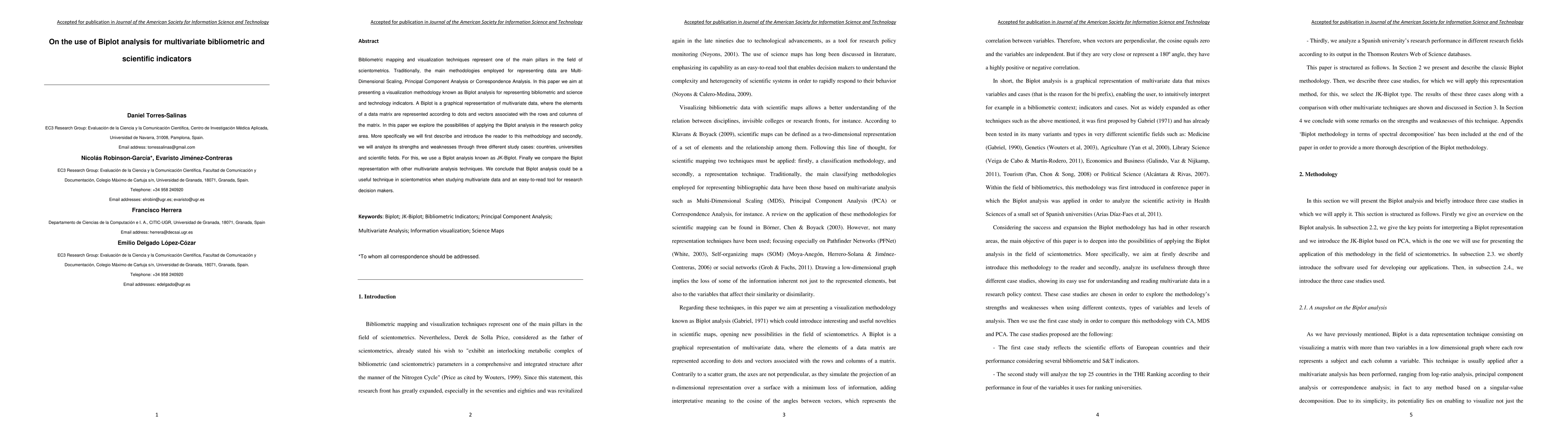 This paper introduces Biplot analysis as a visualization technique for bibliometric and scientific indicators, comparing it to traditional methods like Multi-Dimensional Scaling and PCA. It explores the JK-Biplot's application in analyzing countries, universities, and scientific fields, concluding that Biplot analysis offers a clear and useful tool for research policy.