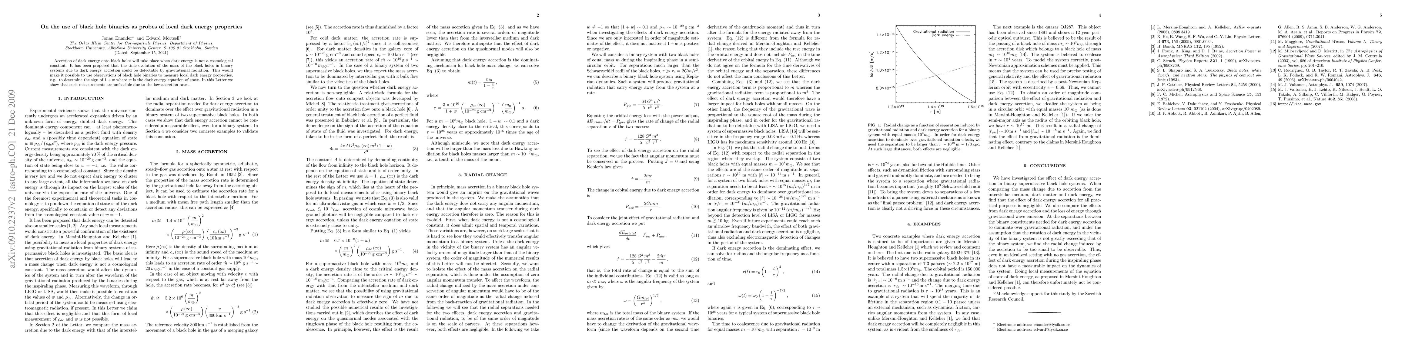This paper explores the potential of black hole binaries to probe local dark energy properties through gravitational radiation. However, it concludes that detecting dark energy accretion onto black holes is impractical due to extremely low accretion rates.