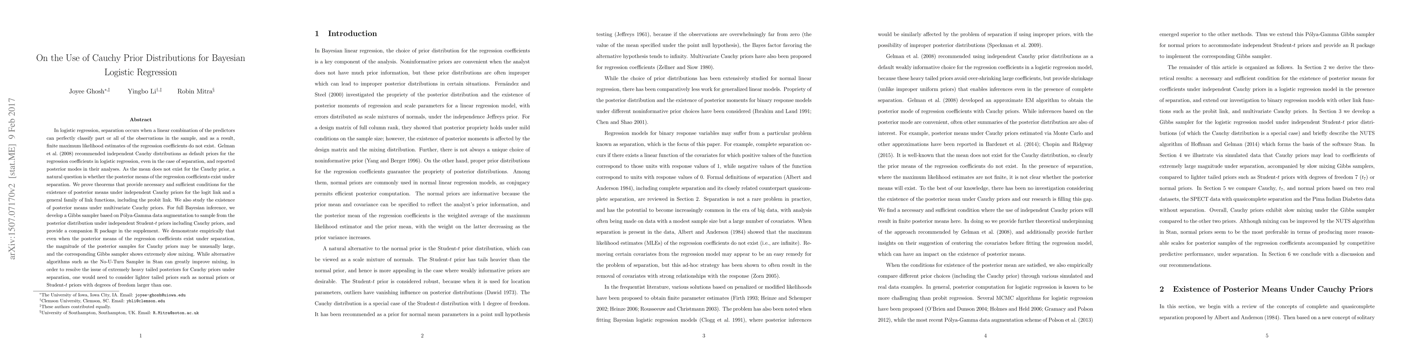 This paper investigates the use of Cauchy priors for Bayesian logistic regression in the presence of separation, proving conditions for the existence of posterior means under such priors. It also develops a Gibbs sampler for full Bayesian inference and finds that while posterior means may exist, the resulting samples can be unusually large and mixing can be slow, suggesting the use of lighter-tailed priors for better performance.