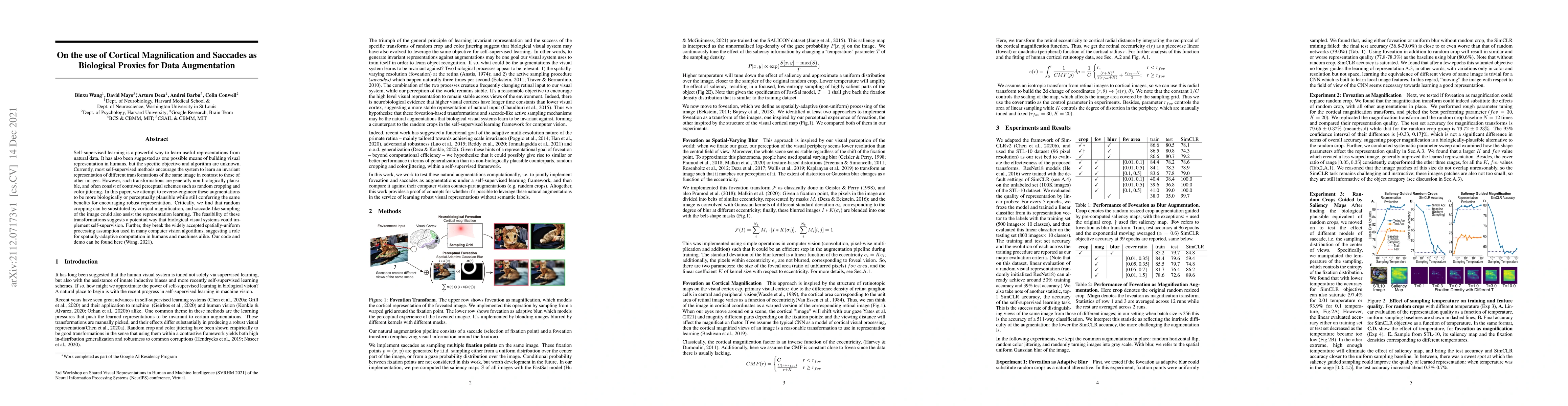This paper explores biologically plausible data augmentation techniques, such as cortical magnification and saccade-like sampling, to improve self-supervised learning. It suggests these methods could mirror how biological visual systems might implement self-supervision, challenging the uniform processing assumption in computer vision.