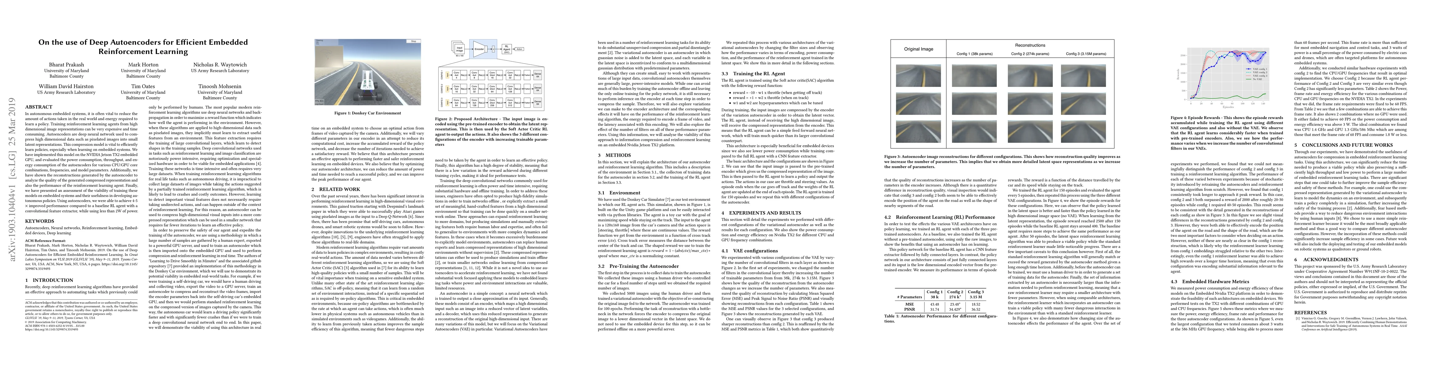 In autonomous embedded systems, it is often vital to reduce the amount of actions taken in the real world and energy required to learn a policy. Training reinforcement learning agents from high dimensional image representations can be very expensive and time consuming. Autoencoders are deep neural network used to compress high dimensional data such as pixelated images into small latent representations. This compression model is vital to efficiently learn policies, especially when learning on embedded systems. We have implemented this model on the NVIDIA Jetson TX2 embedded GPU, and evaluated the power consumption, throughput, and energy consumption of the autoencoders for various CPU/GPU core combinations, frequencies, and model parameters. Additionally, we have shown the reconstructions generated by the autoencoder to analyze the quality of the generated compressed representation and also the performance of the reinforcement learning agent. Finally, we have presented an assessment of the viability of training these models on embedded systems and their usefulness in developing autonomous policies. Using autoencoders, we were able to achieve 4-5 $\times$ improved performance compared to a baseline RL agent with a convolutional feature extractor, while using less than 2W of power.