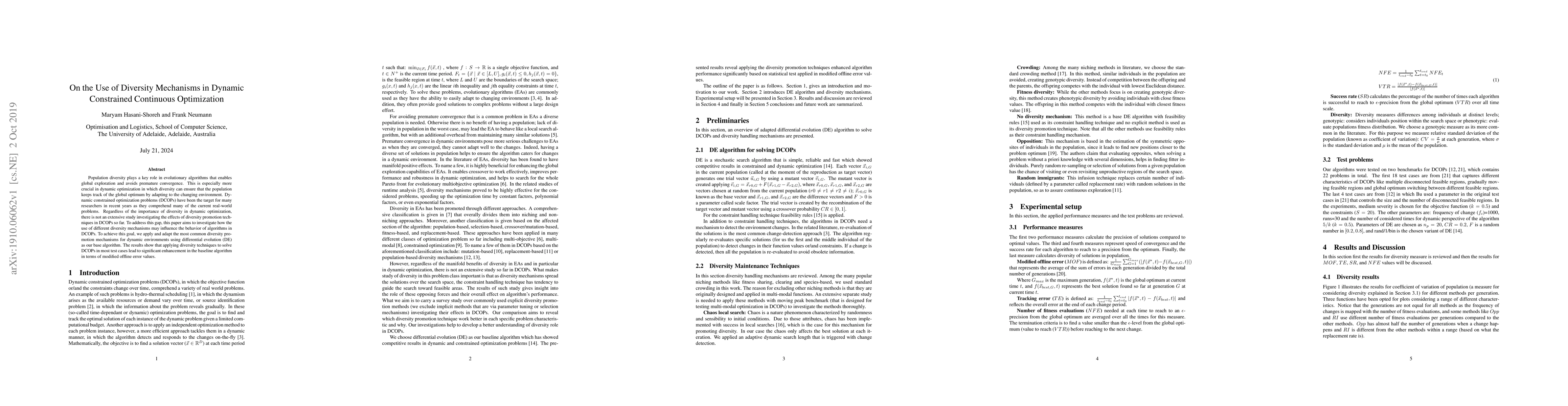 This paper investigates the impact of various diversity mechanisms on the performance of evolutionary algorithms in solving dynamic constrained optimization problems (DCOPs). By applying and adapting common diversity promotion techniques to differential evolution, the study finds that these mechanisms significantly improve the algorithm's ability to track the global optimum in changing environments.