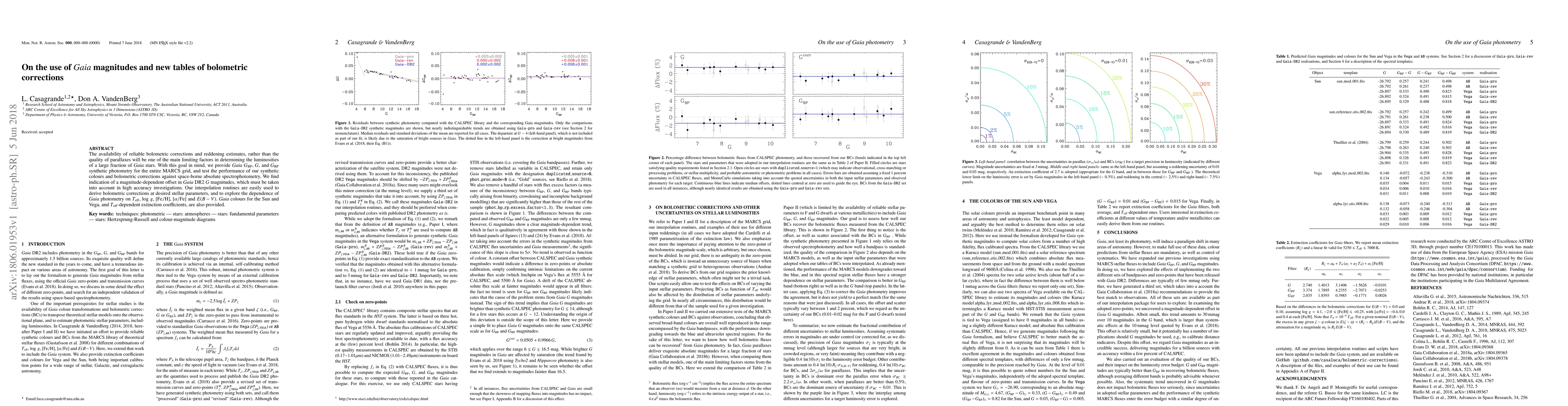 The availability of reliable bolometric corrections and reddening estimates, rather than the quality of parallaxes will be one of the main limiting factors in determining the luminosities of a large fraction of Gaia stars. With this goal in mind, we provide Gaia G, BP and RP synthetic photometry for the entire MARCS grid, and test the performance of our synthetic colours and bolometric corrections against space-borne absolute spectrophotometry. We find indication of a magnitude-dependent offset in Gaia DR2 G magnitudes, which must be taken into account in high accuracy investigations. Our interpolation routines are easily used to derive bolometric corrections at desired stellar parameters, and to explore the dependence of Gaia photometry on Teff, log(g), [Fe/H], alpha-enhancement and E(B-V). Gaia colours for the Sun and Vega, and Teff-dependent extinction coefficients, are also provided.
