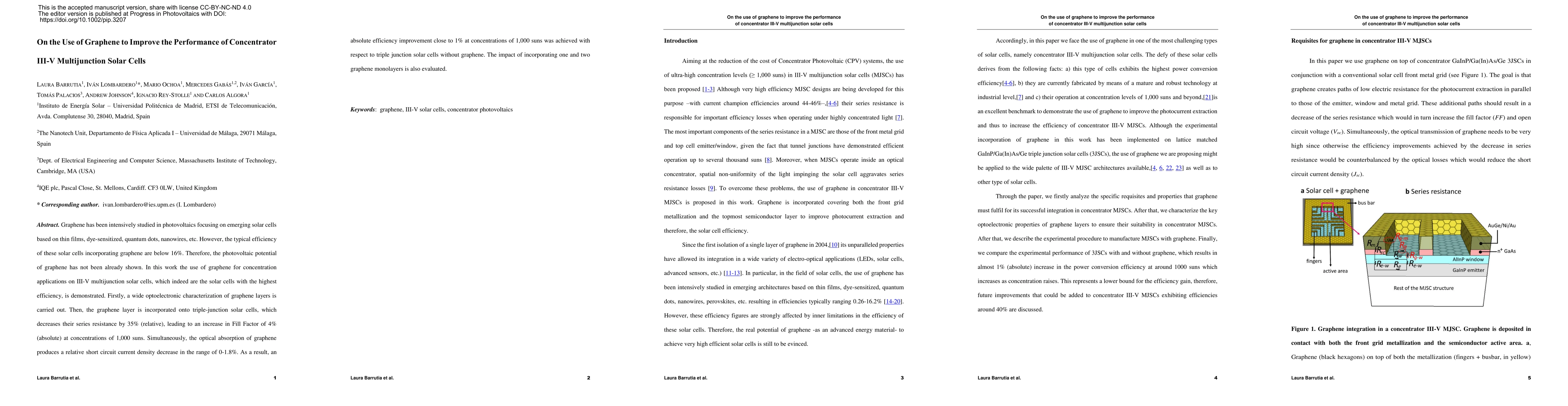 This paper demonstrates that incorporating graphene into III-V multijunction solar cells reduces their series resistance by 35%, leading to a 4% increase in Fill Factor and a near 1% absolute efficiency improvement at 1,000 suns concentration, despite a minor decrease in short circuit current density.