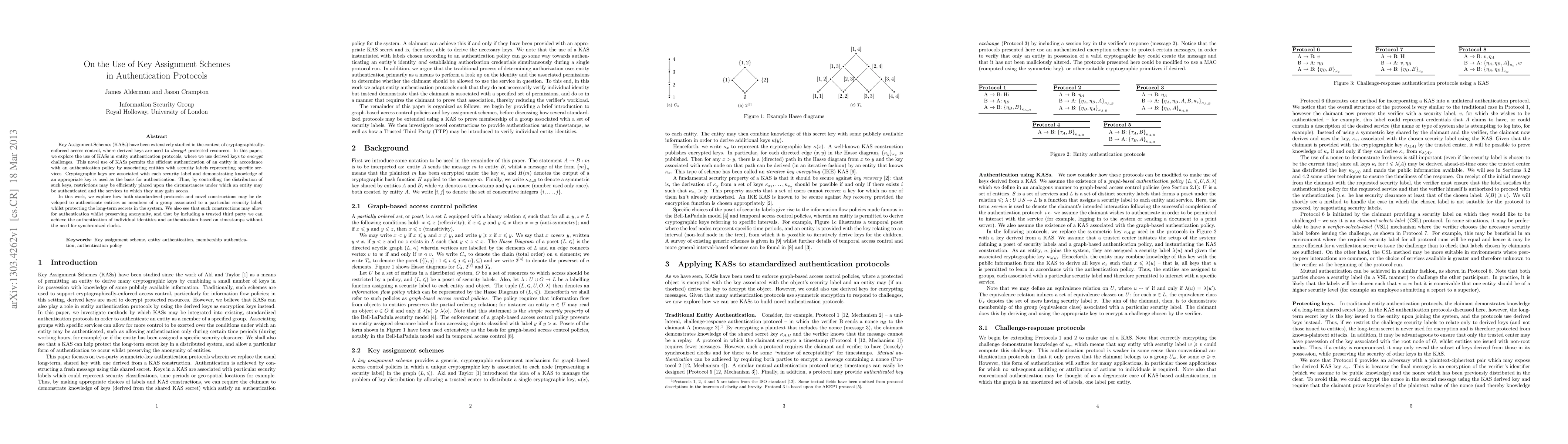 Key Assignment Schemes (KASs) have been extensively studied in the context of cryptographically-enforced access control, where derived keys are used to decrypt protected resources. In this paper, we explore the use of KASs in entity authentication protocols, where we use derived keys to encrypt challenges. This novel use of KASs permits the efficient authentication of an entity in accordance with an authentication policy by associating entities with security labels representing specific services. Cryptographic keys are associated with each security label and demonstrating knowledge of an appropriate key is used as the basis for authentication. Thus, by controlling the distribution of such keys, restrictions may be efficiently placed upon the circumstances under which an entity may be authenticated and the services to which they may gain access. In this work, we explore how both standardized protocols and novel constructions may be developed to authenticate entities as members of a group associated to a particular security label, whilst protecting the long-term secrets in the system. We also see that such constructions may allow for authentication whilst preserving anonymity, and that by including a trusted third party we can achieve the authentication of individual identities and authentication based on timestamps without the need for synchronized clocks.