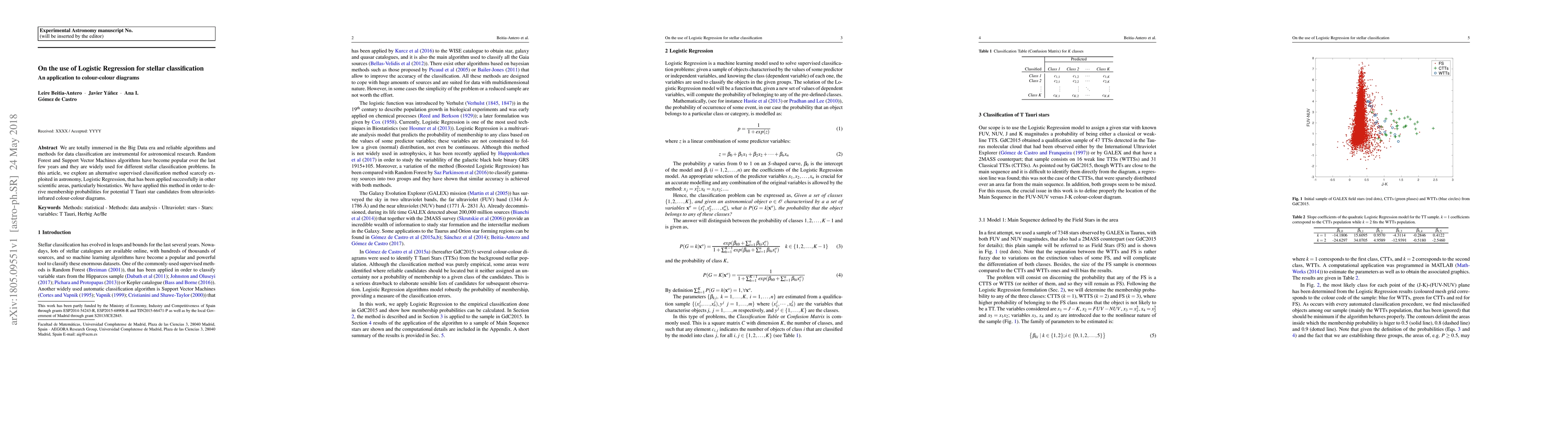 This paper investigates Logistic Regression as an alternative to popular machine learning methods for classifying stellar objects, specifically applying it to determine membership probabilities for T Tauri stars in ultraviolet-infrared colour-colour diagrams. The study aims to demonstrate the potential of Logistic Regression in astronomical research, drawing on its success in biostatistics.