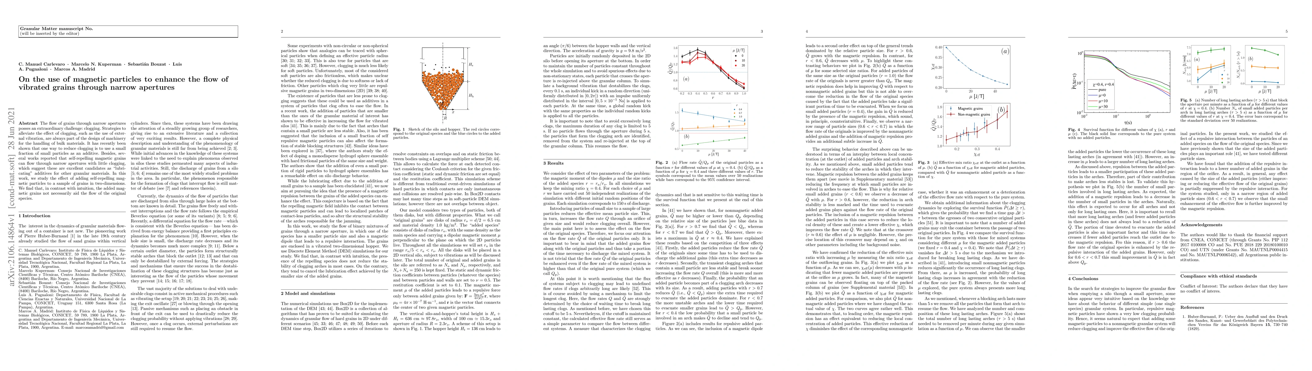 This research investigates the use of magnetic particles to enhance the flow of vibrated grains through narrow apertures, finding that contrary to expectations, the addition of self-repelling magnetic grains does not necessarily improve the flow of the original granular material.