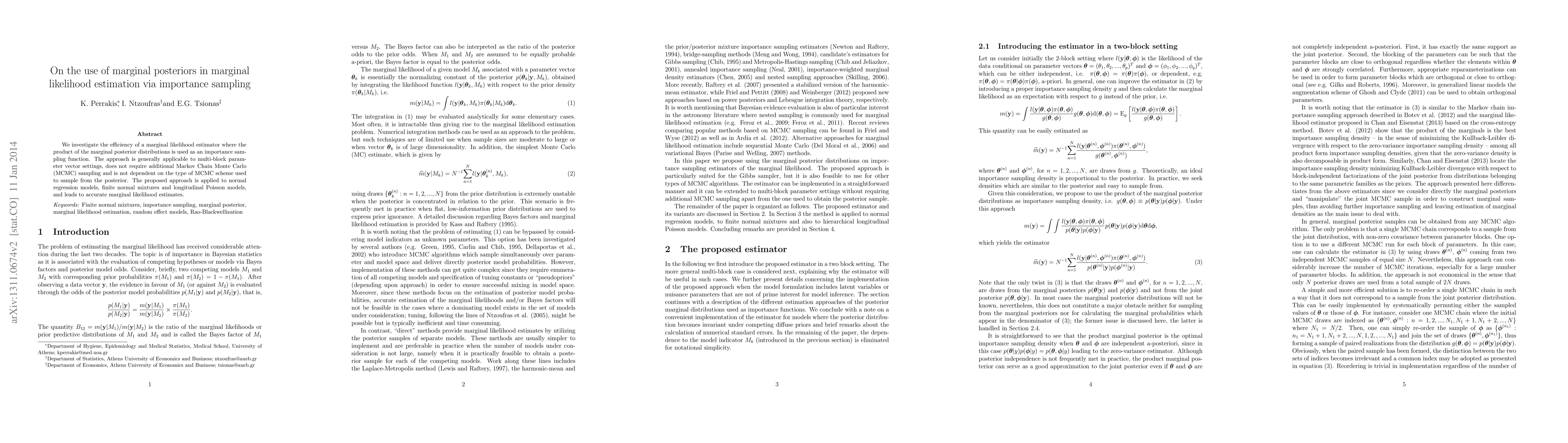 We investigate the efficiency of a marginal likelihood estimator where the product of the marginal posterior distributions is used as an importance-sampling function. The approach is generally applicable to multi-block parameter vector settings, does not require additional Markov Chain Monte Carlo (MCMC) sampling and is not dependent on the type of MCMC scheme used to sample from the posterior. The proposed approach is applied to normal regression models, finite normal mixtures and longitudinal Poisson models, and leads to accurate marginal likelihood estimates.