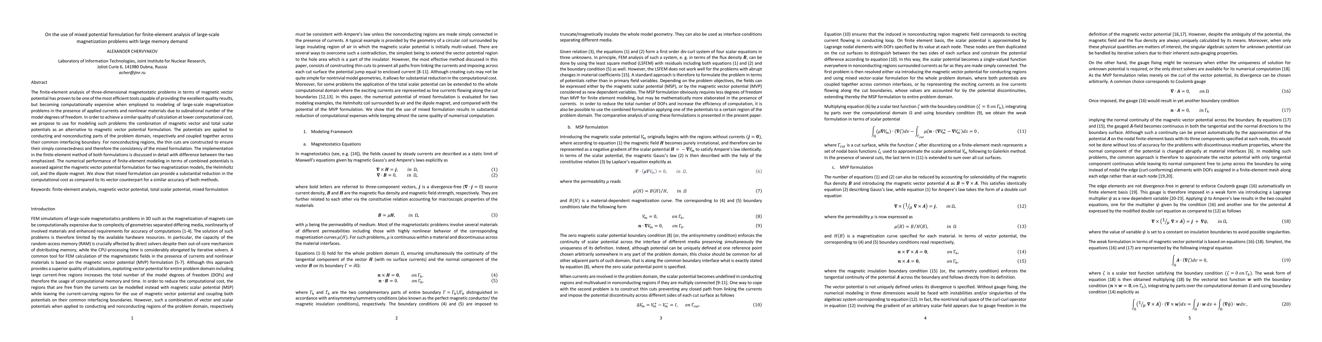 This paper proposes a mixed potential formulation combining magnetic vector and total scalar potentials for finite-element analysis of large-scale magnetization problems, demonstrating significant computational cost reduction compared to the traditional magnetic vector potential approach while maintaining similar accuracy.